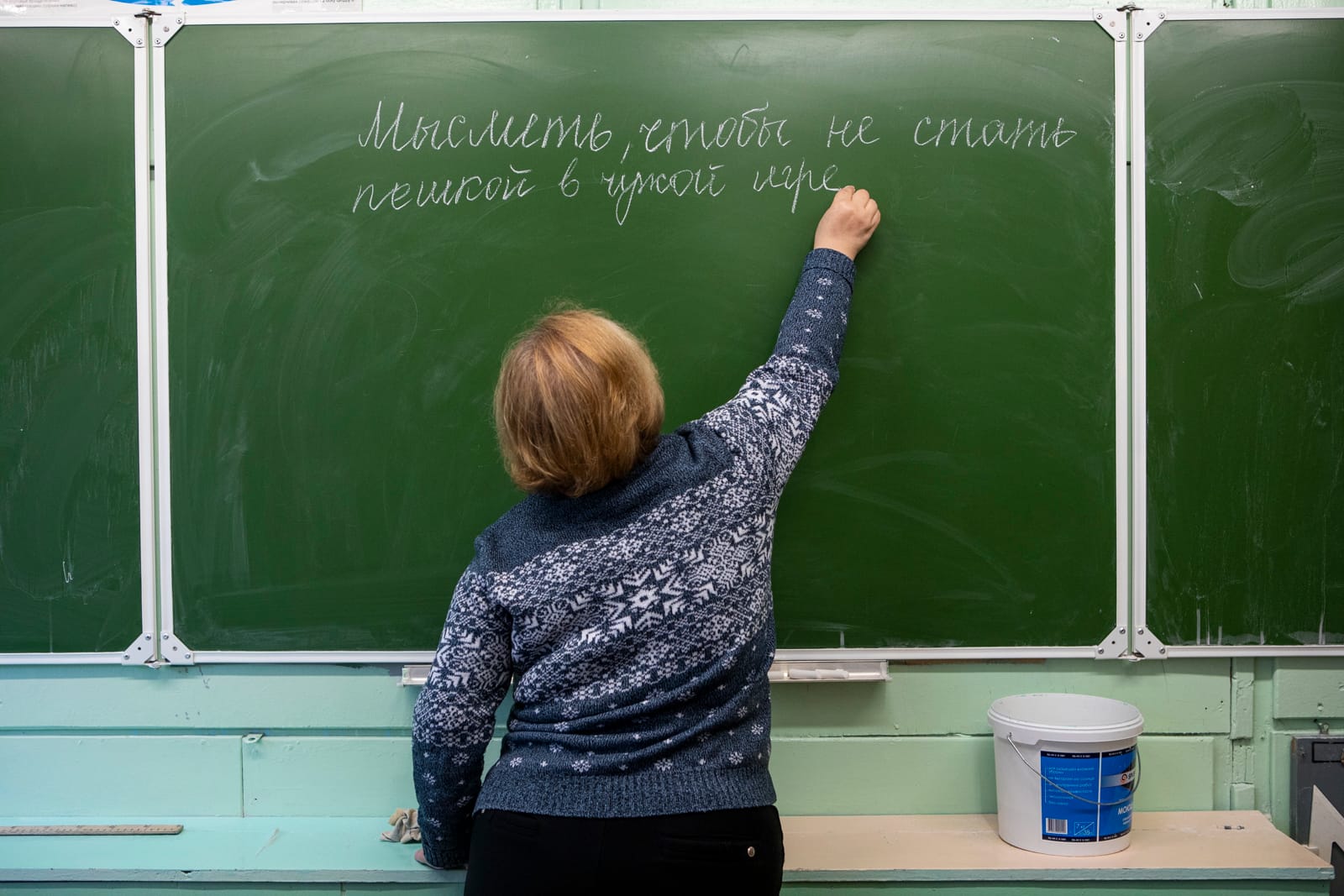 To illustrate their responses, we asked the teachers to write a single lesson idea for their pupils. The teachers who are still working in Belarus’ education system wrote theirs on the blackboard, and those who have been fired for political reasons had to do it outside.