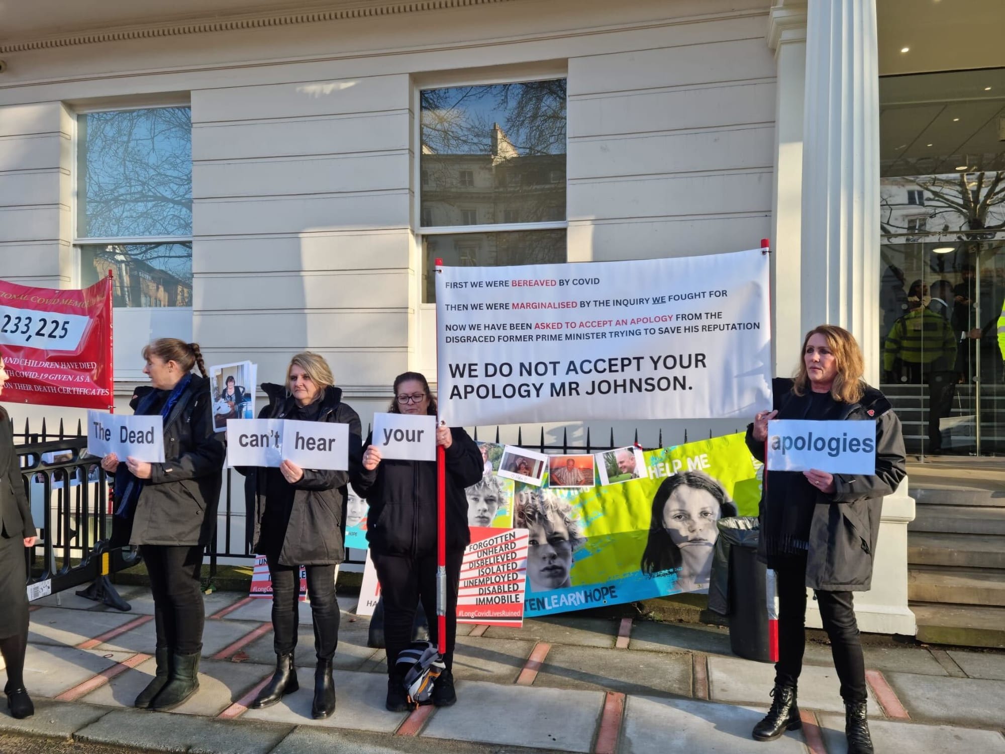 As his evidence got under way, four protesters were thrown out for standing up with signs that read: “The dead can’t hear your apology”, in reference to reports he was set to apologise for the pain, loss and suffering of Covid victims, which he then did do.