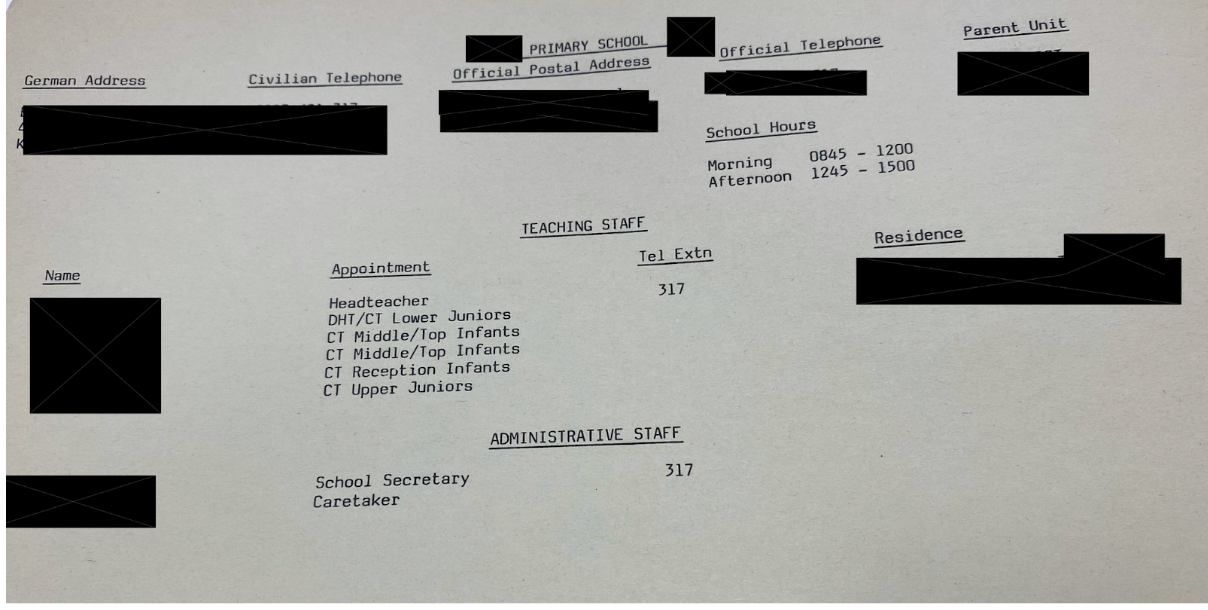 Had officers done so, they would have found the Staff Directory for Service Children's Schools North West Europe October 1988. Of the 84 British Army-run schools in Germany mentioned in the directory, Anne and Jane’s former school is one of just 17 to include caretakers in its staff list. It names the alleged perpetrator as “administrative staff”.