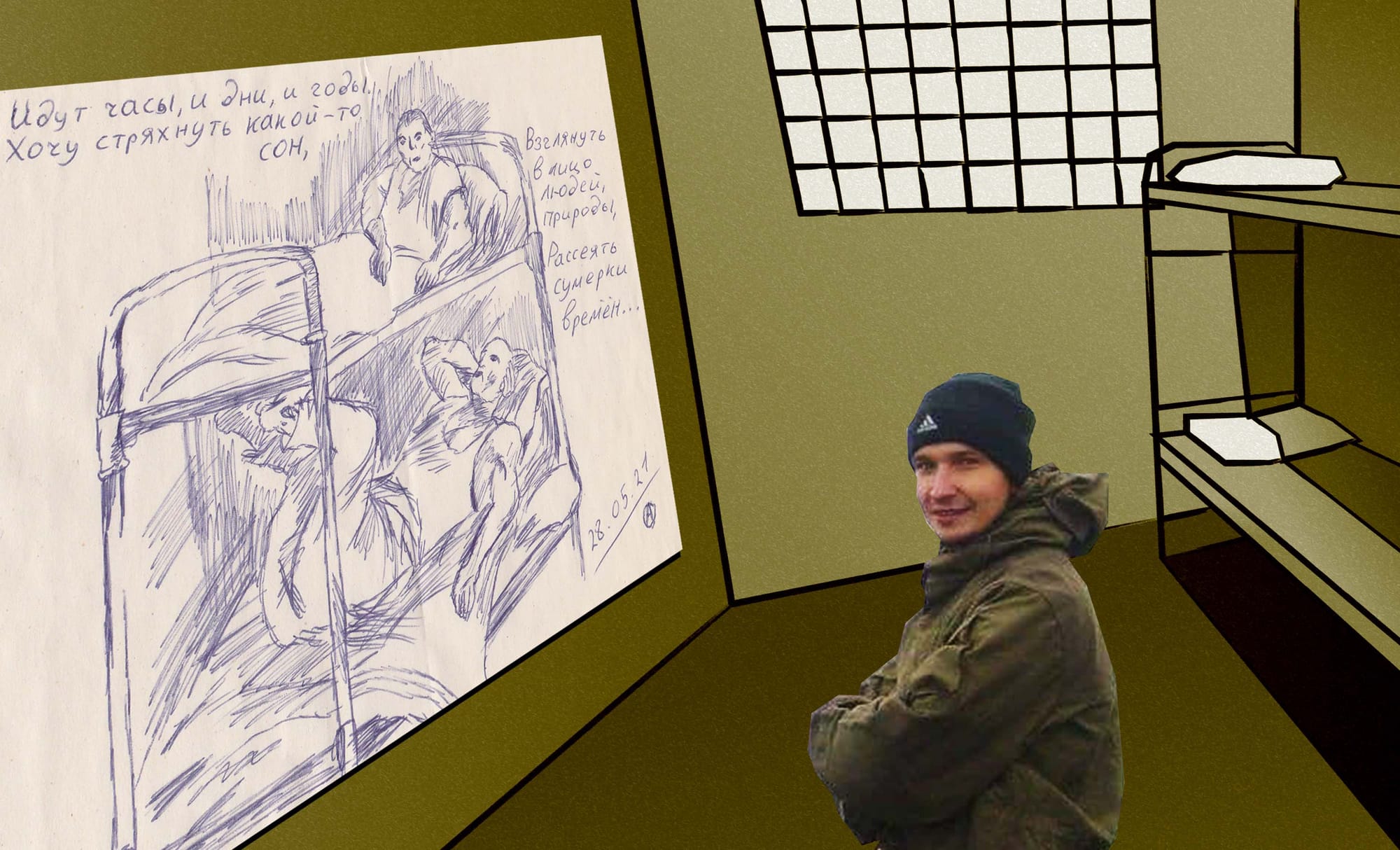 Ales Pushkin, an artist and performer, was detained on 30 March this year, and is charged with “rehabilitating Nazism”. Now in prison, he sends his friend Valeria drawings and drafts of a future book.