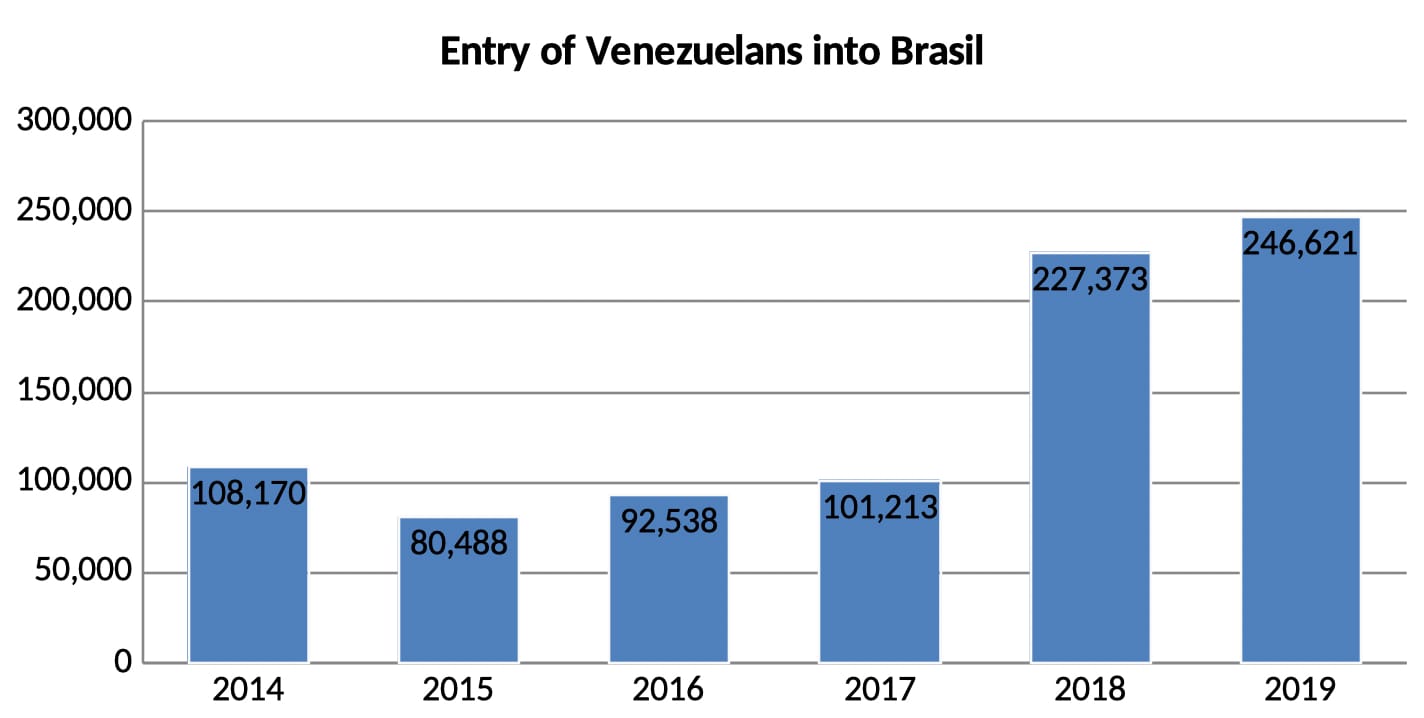 Since 2015, half a million Venezuelans have crossed the border into Brazil, i.e. approx. 10% of the estimated total of displaced Venezuelans worldwide, either to settle (over 250 thousand) or in transit to other countries. The majority crossed the border between the two countries in the cities of Santa Elena de Uairén (Venezuela) and Pacaraima (Brazil), arriving in the least populous of the Brazilian States: Roraima.