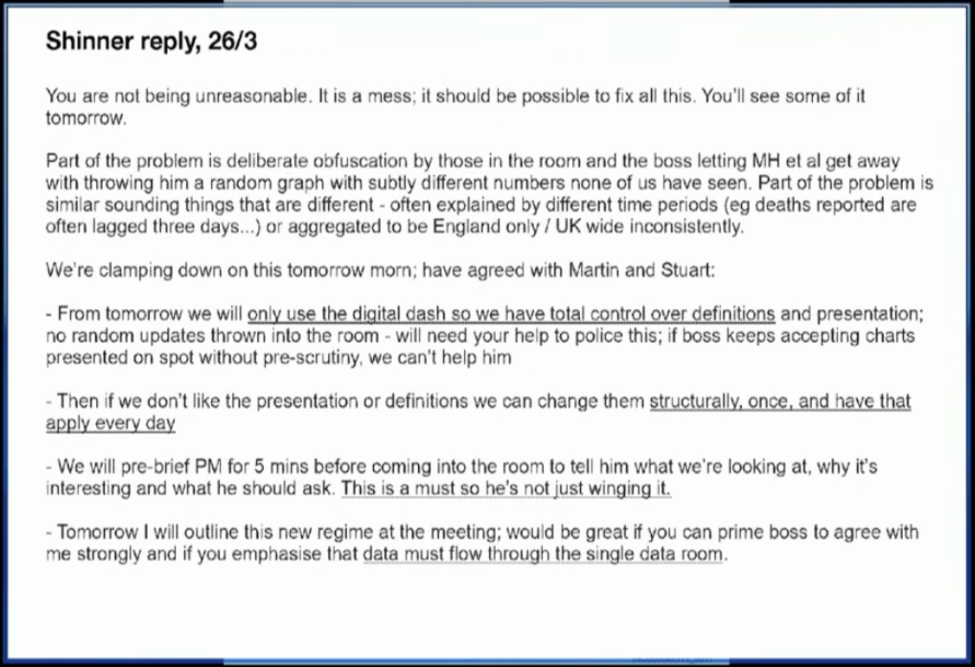 The issues he raised in an email to a fellow Number 10 staffer dated 25 March 2020 – two days after the national lockdown was announced – included inconsistent or incomplete data on key measures including infection rates, intensive care bed availability, and the number of Covid deaths each day.