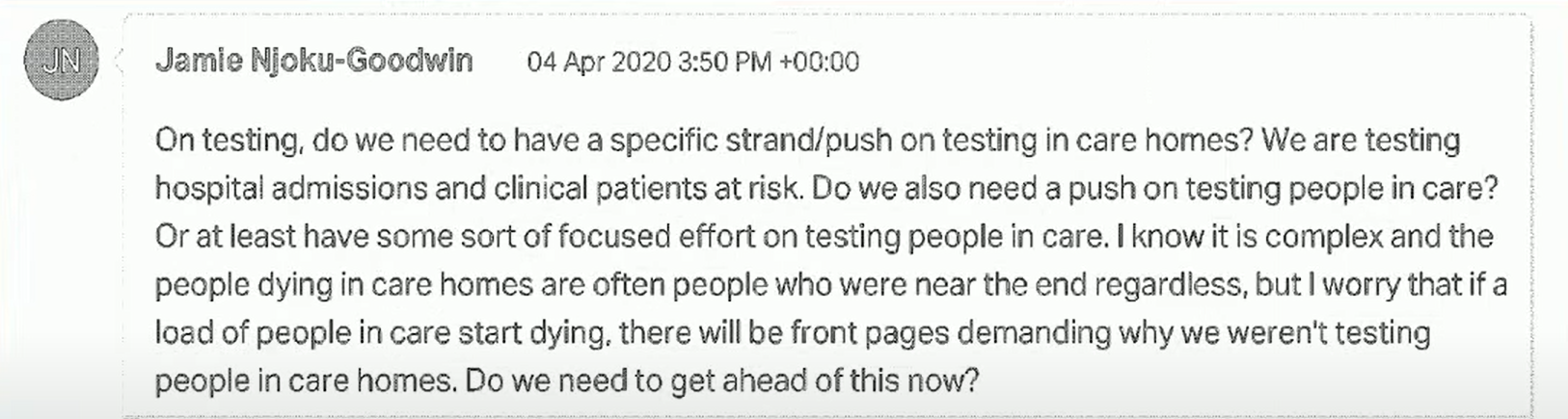 Njoku-Goodwin wrote: “I know it’s complex and the people dying in care homes are often people who were near the end regardless, but I worry that if a load of people in care start dying, there will be front pages demanding why we weren't testing people in care homes. Do we need to get ahead of this now?”