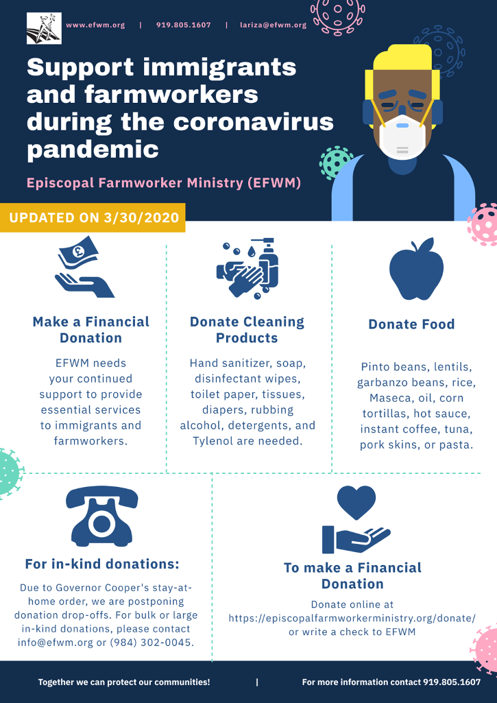 Lariza Garzon and the Episcopal Farmworker Ministry saw their food delivery for farmworkers in Dunn, North Carolina swamped on March 27 by immigrant families in search of basic foodstuffs. According to Ms Garzon, more than 200 families came to the EFWM’s offices, and at least 50 families were forced to leave empty handed.