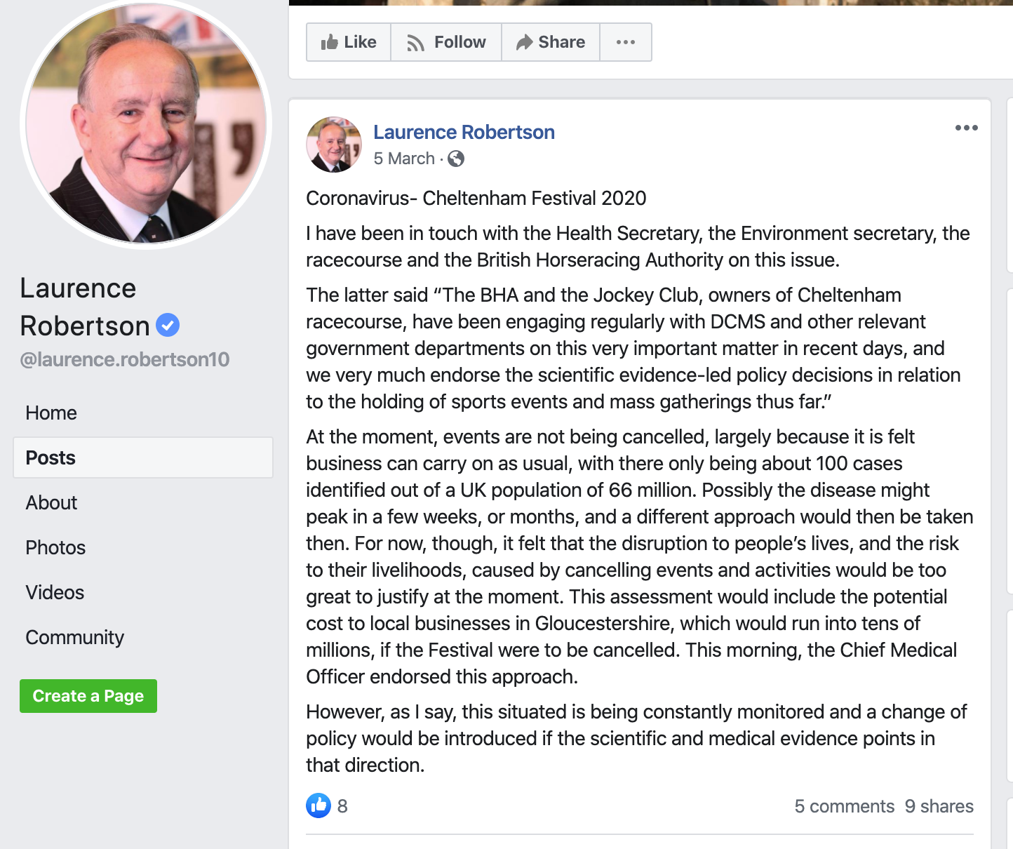 Laurence Robertson – whose Gloucestershire constituency includes Cheltenham racecourse – chairs the All Party Parliamentary Group on Racing and is a regular recipient of hospitality from the gambling industry.