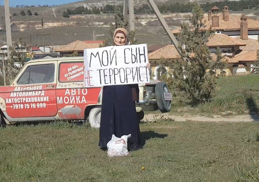 A week after Ruslan’s arrest, his mother Zera picketed against the prosecution of Crimean Tatars on terrorism charges. She stood with a placard reading “My son is not a terrorist” in the same place where, a year and a half before, Ruslan had protested in support of people arrested in Bakhchisaray for holding a placard reading: “In 1944 they exiled us, now they imprison us.”
