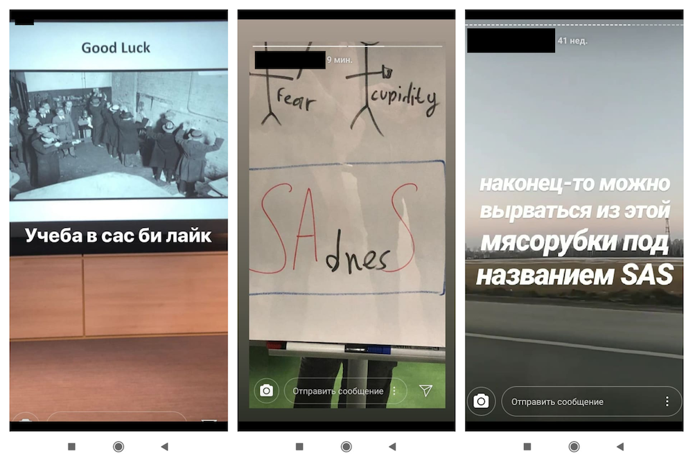 Social media posts by students about SAS (from left to right): "Studying at SAS be like"; "Fear, Stupidity, SAdnesS"; "At last I can get out of this meatgrinder called SAS".