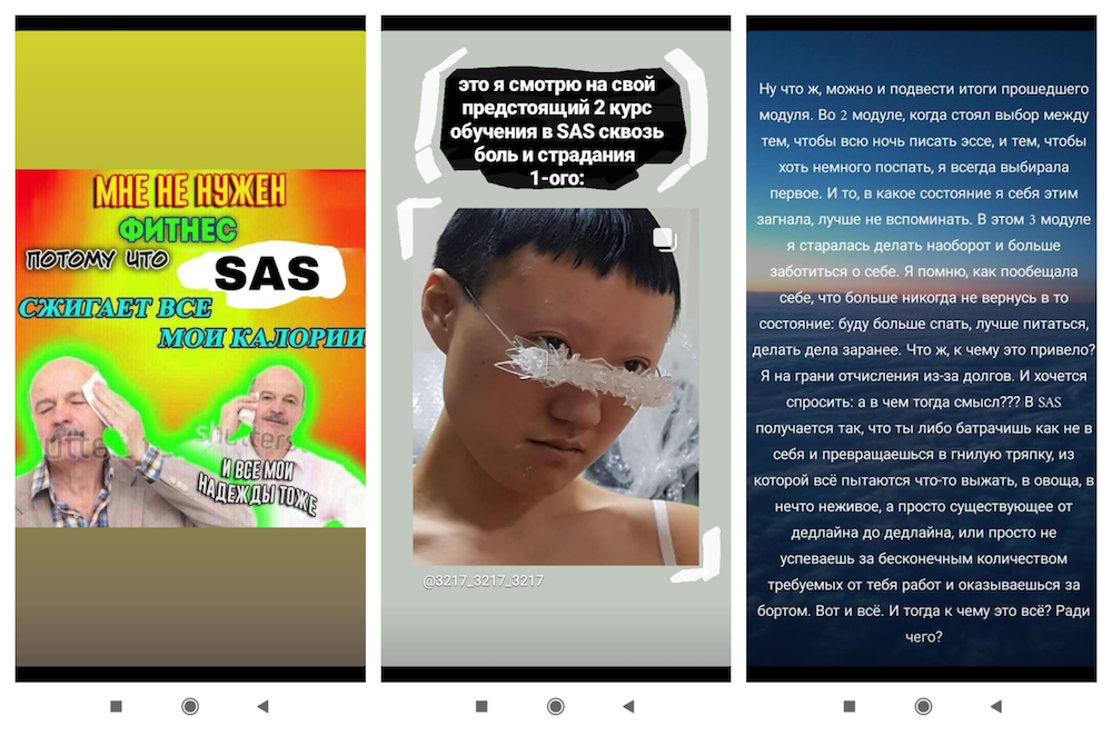 Social media posts by SAS students (from left to right): "I don't need to exercise because SAS burns all my calories, and all my hopes too"; "This is me looking at the second year of SAS through the pain and suffering of the first"; Excerpt: "In SAS it works out that either you work yourself to the bone and turn into a rotten rag which they try to squeeze everything out of, into a vegetable, into something that is not alive, but that just exists from deadline to deadline, or you just can't keep up with the endless amount of work that is demanded from you, and you find yourself overboard. That's it. And the question is, why? For what?"