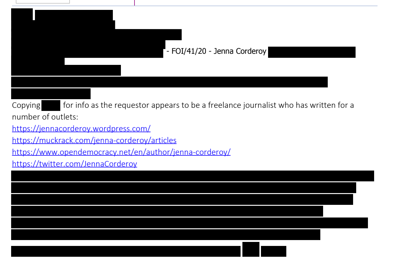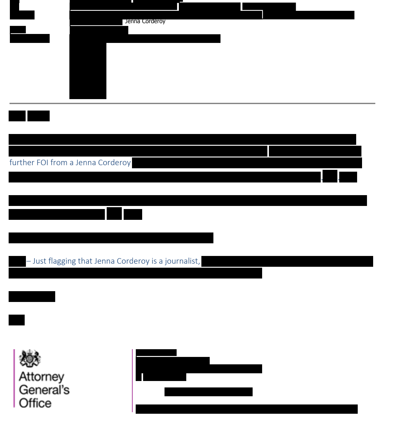 Staff at the Attorney General’s Office (AGO) saw no issue in “just flagging that Jenna Corderoy is a journalist” or warning that “once the response is confirmed, I’ll just need [redacted] to sign off on this before it goes out, since Jenna Corderoy is a reporter for Open Democracy”.