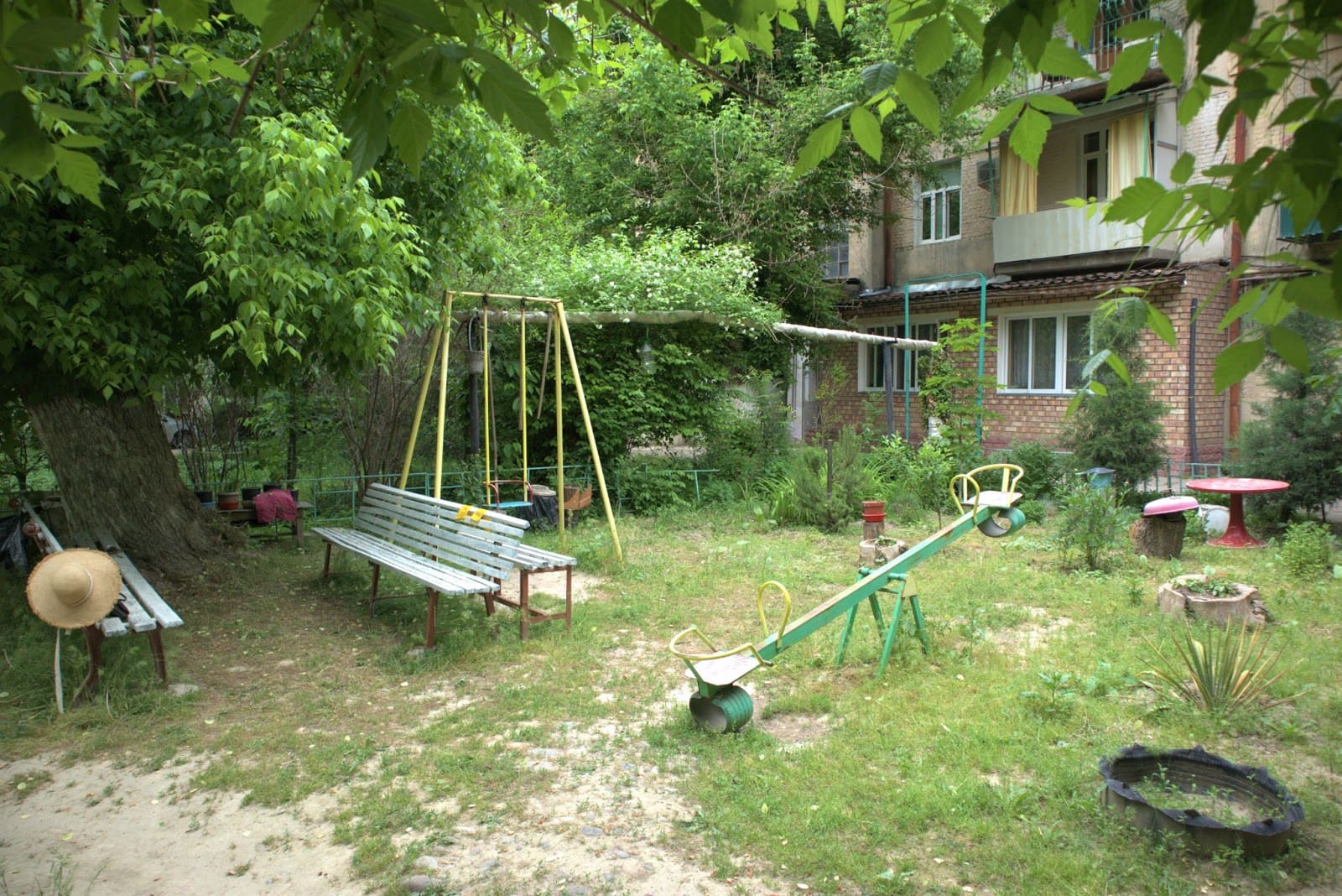 This three-storey building, built in 1936, is home to various nationalities and ethnoreligions – Jews, Koreans, Russians, Uzbeks and Ukrainians – who share a common space – the yard, where children play, adults sit and chat, plant flowers and gather occasionally for a barbecue. There is an eclectic community spirit behind the closed yard, with its collection of tall trees, plants, an empty swimming pool and playground.