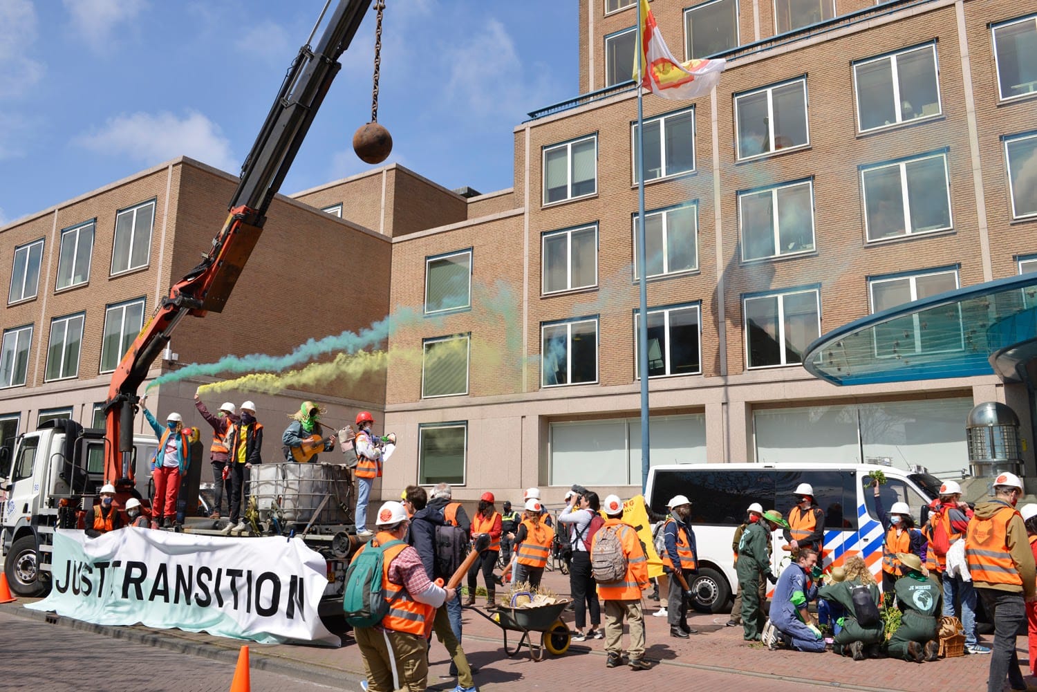 At our last action during Shell’s annual shareholders meeting, we acted out what climate justice could look like. Dressed as construction workers, we took a wrecking ball to the Shell headquarters and informed local residents that the Shell office would be taken down to make place for an International Tribunal for Climate Justice – as called for at the 2010 World People’s Summit in Bolivia.