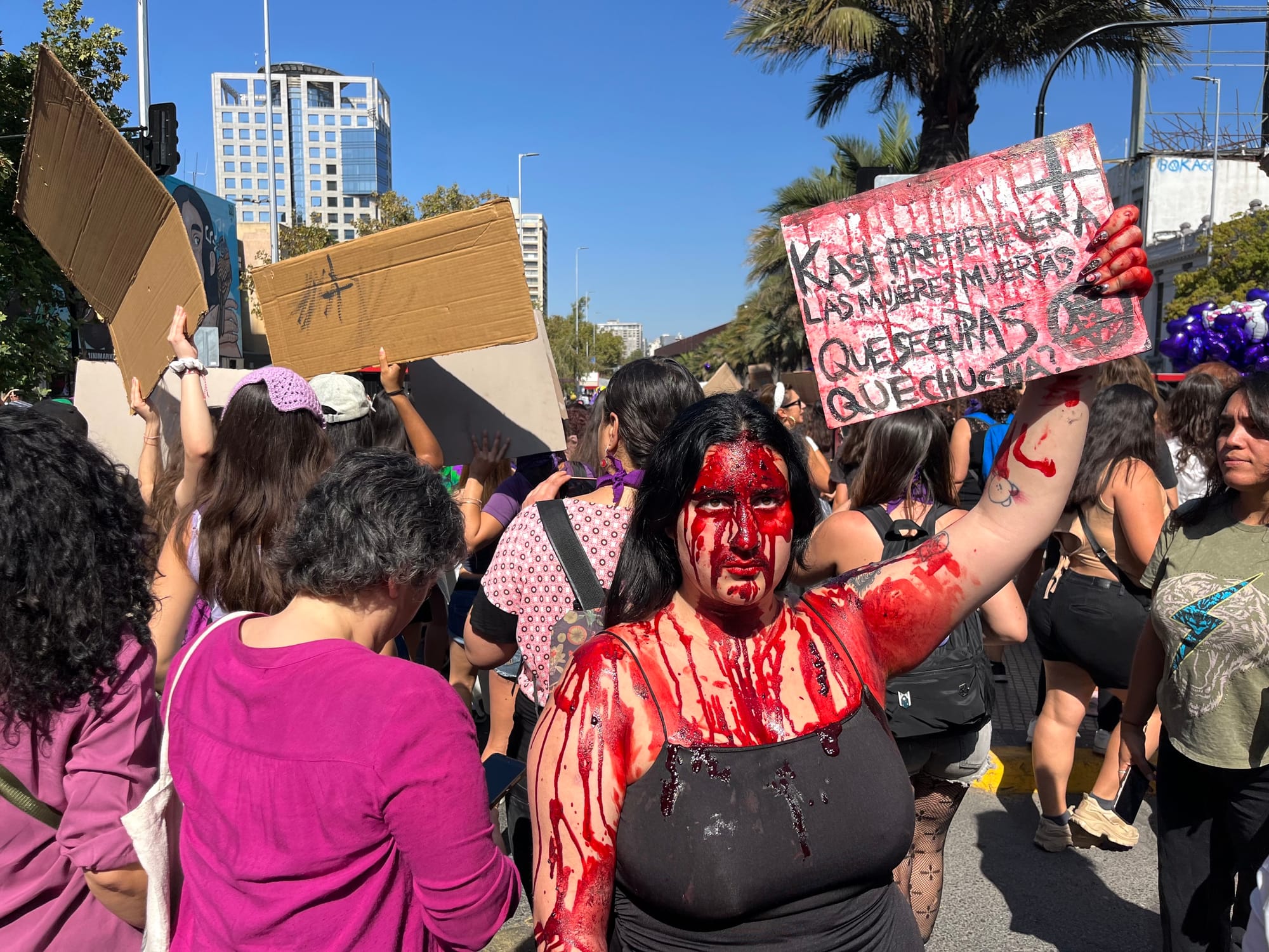 As I watched the protesters dancing, a woman appeared dressed in black, with fake blood streaming across her face and down her body. “How you see me covered in blood is the minimum of what Chile will see in the next four years. We elected a president who is going to kill us,” said 26-year-old Amelie Amoroso. “He who would rather see women dead, [he] will surely free murderers, femicide perpetrators. it’s horrible…” she pauses, close to tears. “But we will not submit to this fascist regime. We will not be submissive. We will be stronger than we have ever been.”