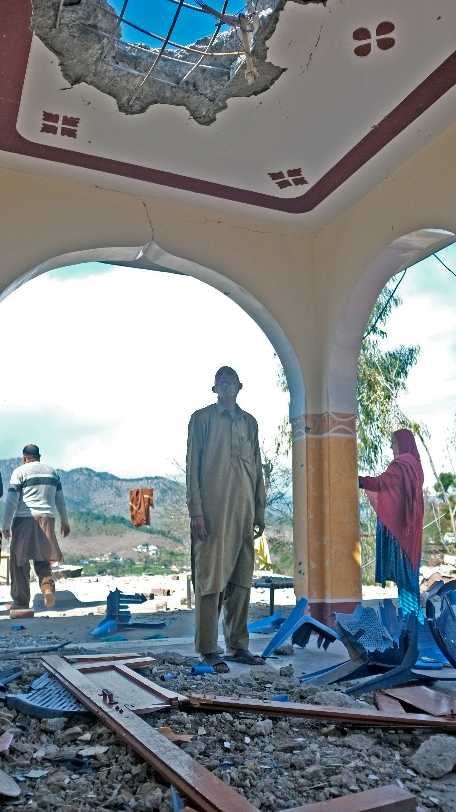 “War does not feel far away here,” says Hajji Mohammed Hussain as he picks up the remains of his roof which was destroyed the night before by a mortar shell. Hajji Mohammed’s house is located in the Poonch district of Pakistan-administered Kashmir. Several homes have been damaged by shelling in the crossfire between India and Pakistan. Mohammed Riaza, a neighbour holds up a piece of shrapnel, “This is an Indian mortar shell,” he says.