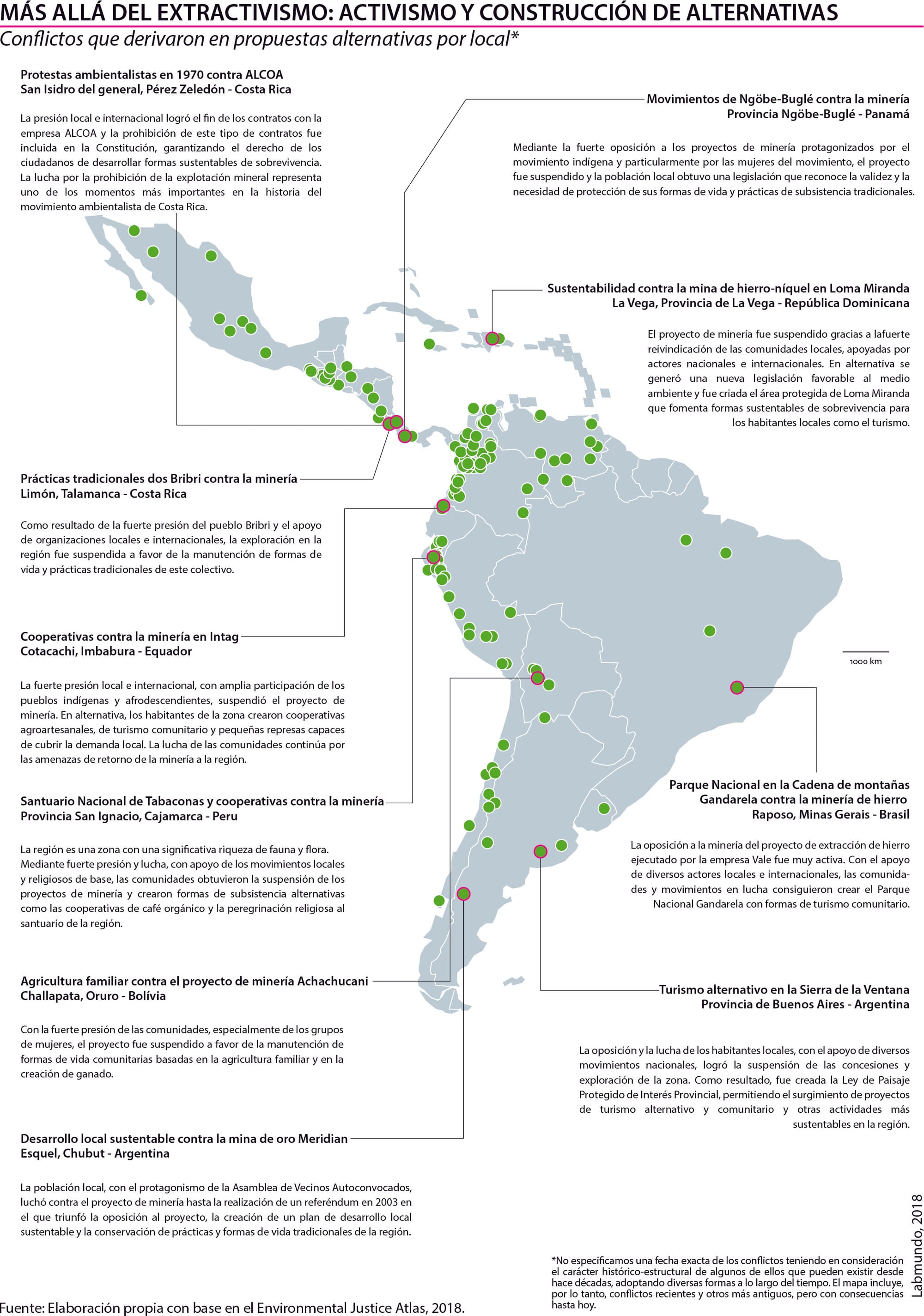 Considering that Latin America and the Caribbean is the most dangerous region for environmental activists and opponents of extractivism, we selected 259 socio-environmental conflicts deriving from mining extractivism in the region. The chosen criteria being: the environmental, gender or ethnic impacts of these conflicts; the forced displacement that they provoke; the active participation of women, afro-descendants and indigenous people; and the role of multinationals and inferred alternatives.