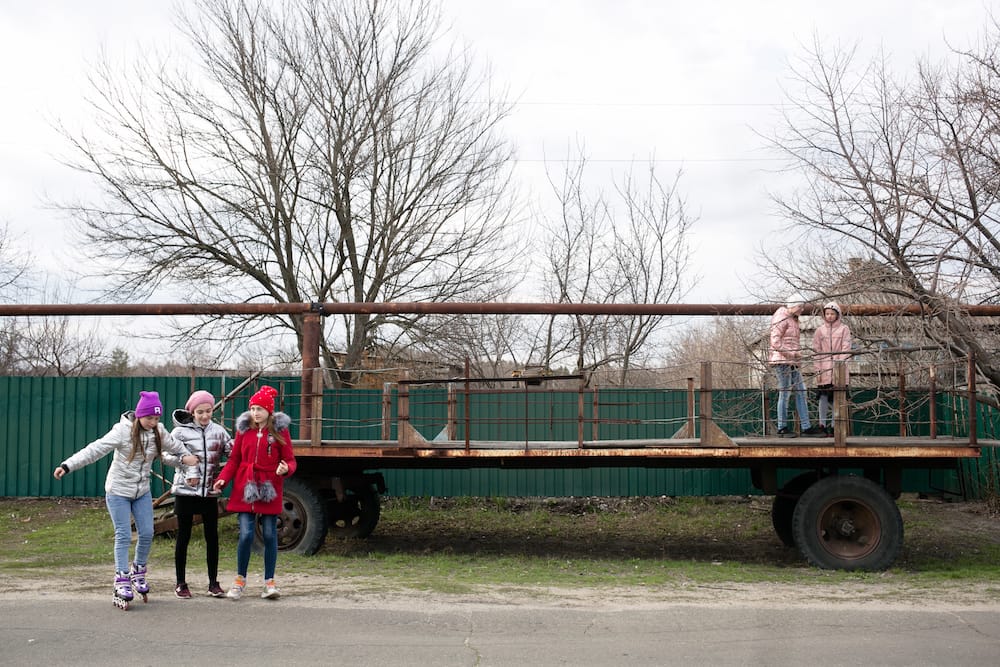 When we arrive on Muratove’s Lisova Street, nature is starting to come back to life. The grass is turning green underfoot, small purple flowers make their way through last year’s foliage. The river, with water that’s barely ankle-deep, flows slowly through the village in an overgrown ditch.