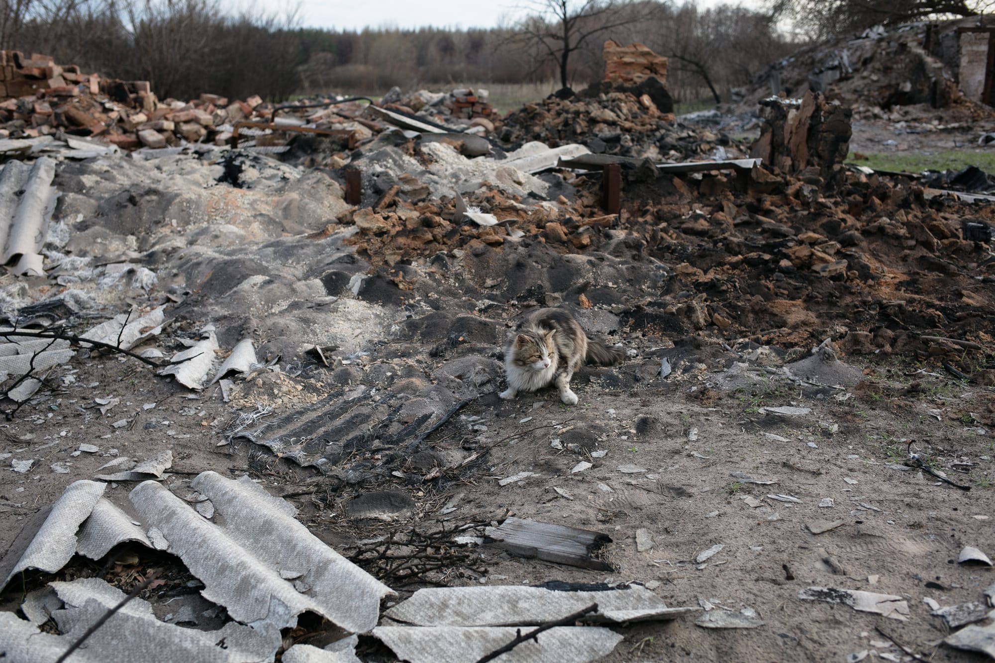 We went with Kurilov to visit the burned-down house of Olexandr Nilovko, on Lugova Street. But our attempts to find it were in vain. It’s a long street, and only small grey piles of ash, slate and bricks remain. In some places, you can see the green walls of a garage destroyed by a fire, or where someone had left crockery out in the yard.