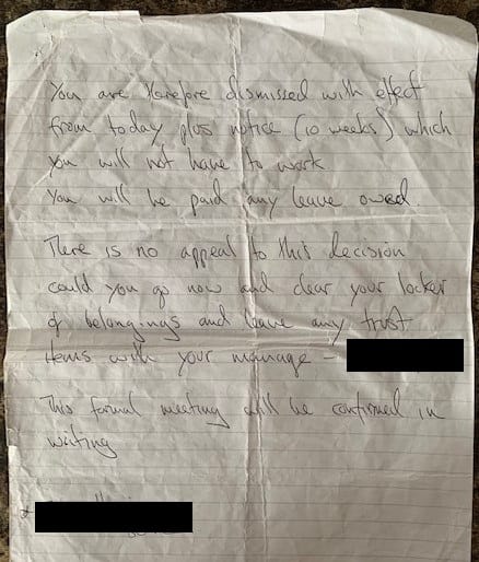 The director held a letter – part typed, part hand-written – which said: “You [Tchamba] are therefore dismissed with effect from today plus notice (10 weeks) which you will not have to work. You will be paid any leave owed. There is no appeal to this decision. Could you go now and clear your locker of belongings.”