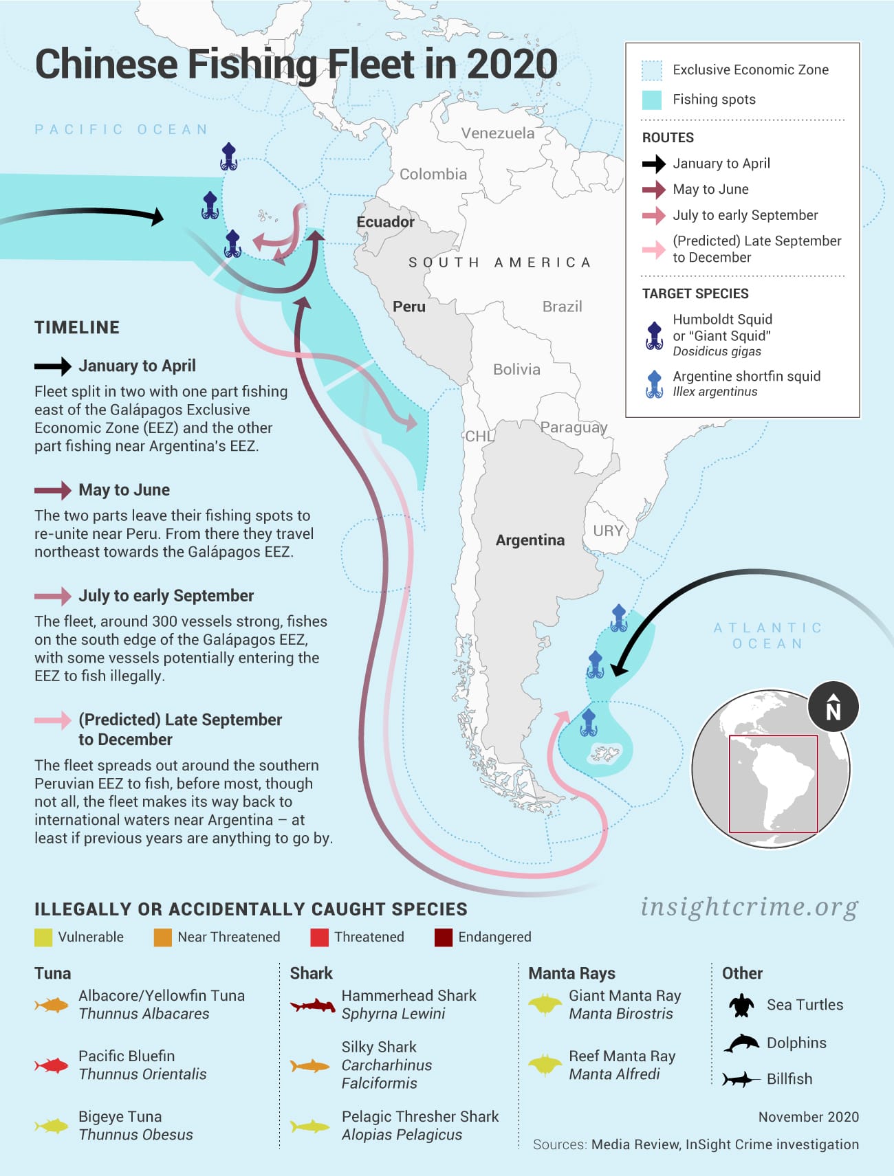 This year, according to both reports and a publicly available map by Global Fishing Watch, part of the Chinese fleet remained east of the Galápagos from January through April while the other part moved to Argentine waters. By May, the two sections had reunited off southern Peru, before moving between the Galápagos EEZ and the waters off mainland Ecuador’s EEZ from May to September, causing the aforementioned international outcry. Since then the fleet has moved south, and is currently largely based around Peru’s southern waters, where its vessels currently fish.