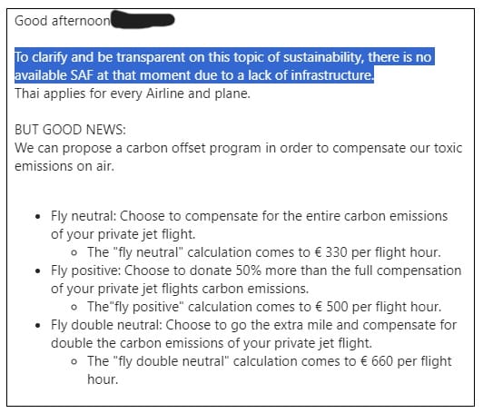 These initiatives include alternatives to kerosene, such as sustainable aviation fuel (SAF), which are deemed to be less polluting, or their work to offset emissions by funding environmental feel-good schemes in the global south.