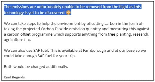 Discussing offsetting, Executive Jet Charter rightly told me “the emissions are unfortunately unable to be removed from the flight as this technology is yet to be discovered”. The spokesperson also included a ‘sad face’ emoji at the end of the sentence, which only partly made me believe they really cared about the future existence of human beings on this planet, before going on to pitch the company’s existing offsetting scheme.