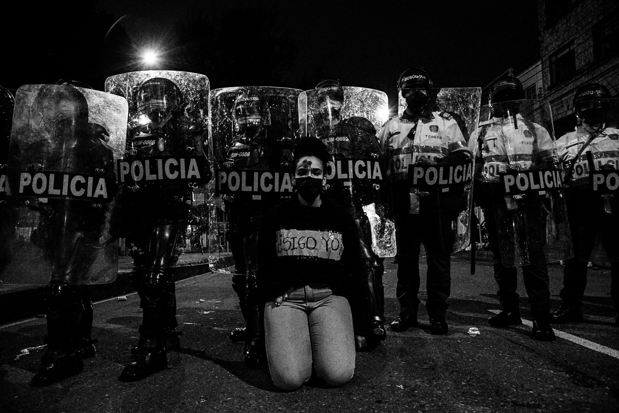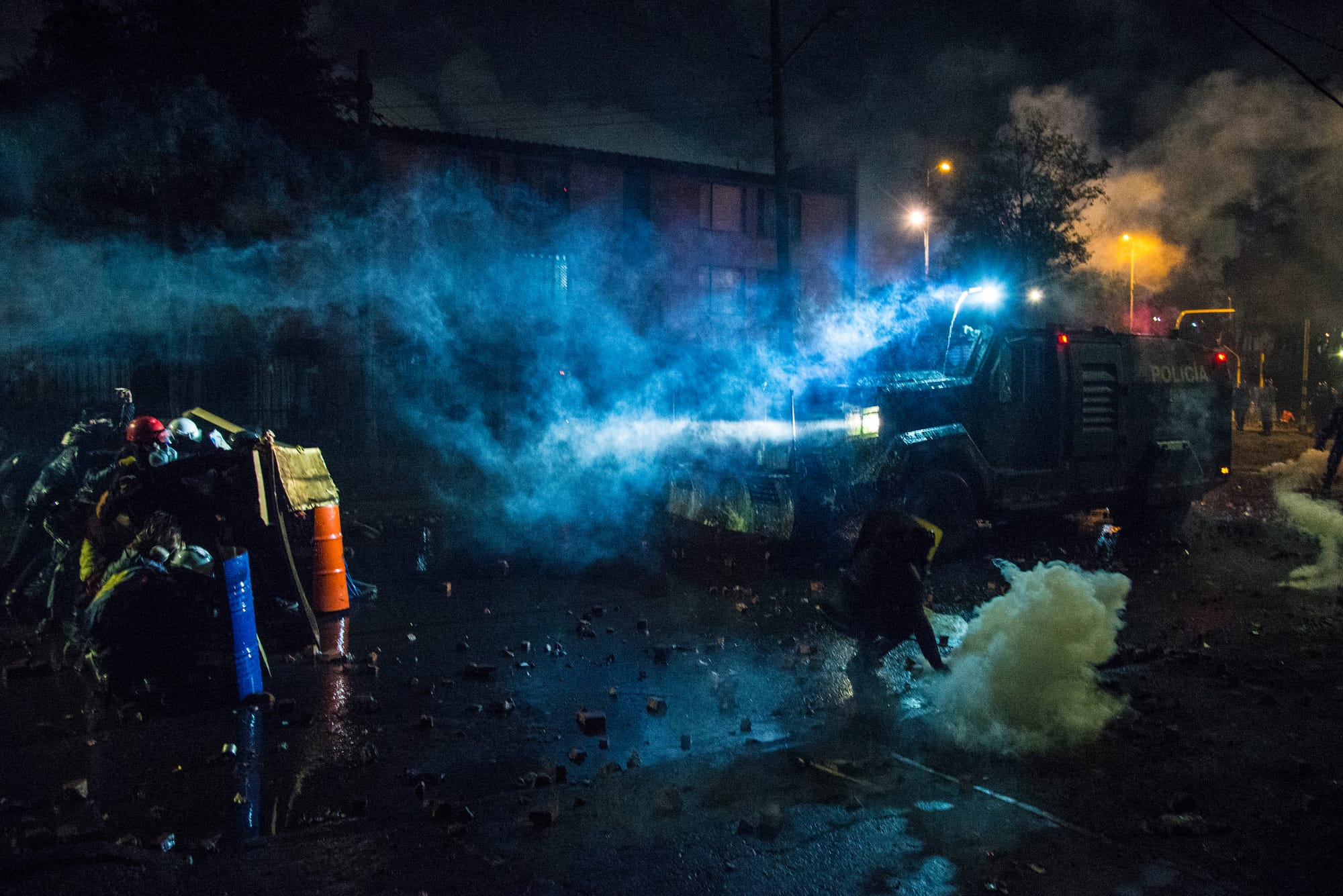 Police brutality is indiscriminate and common. The image shows how the police violate international protocols on the use of non-lethal weapons, shooting directly at protestors rather than firing shots upwards to avoid injuries that could be fatal. According to Indepaz, an NGO in Bogota, 80 people have died as a result of this kind of trigger-happy behaviour by the police.