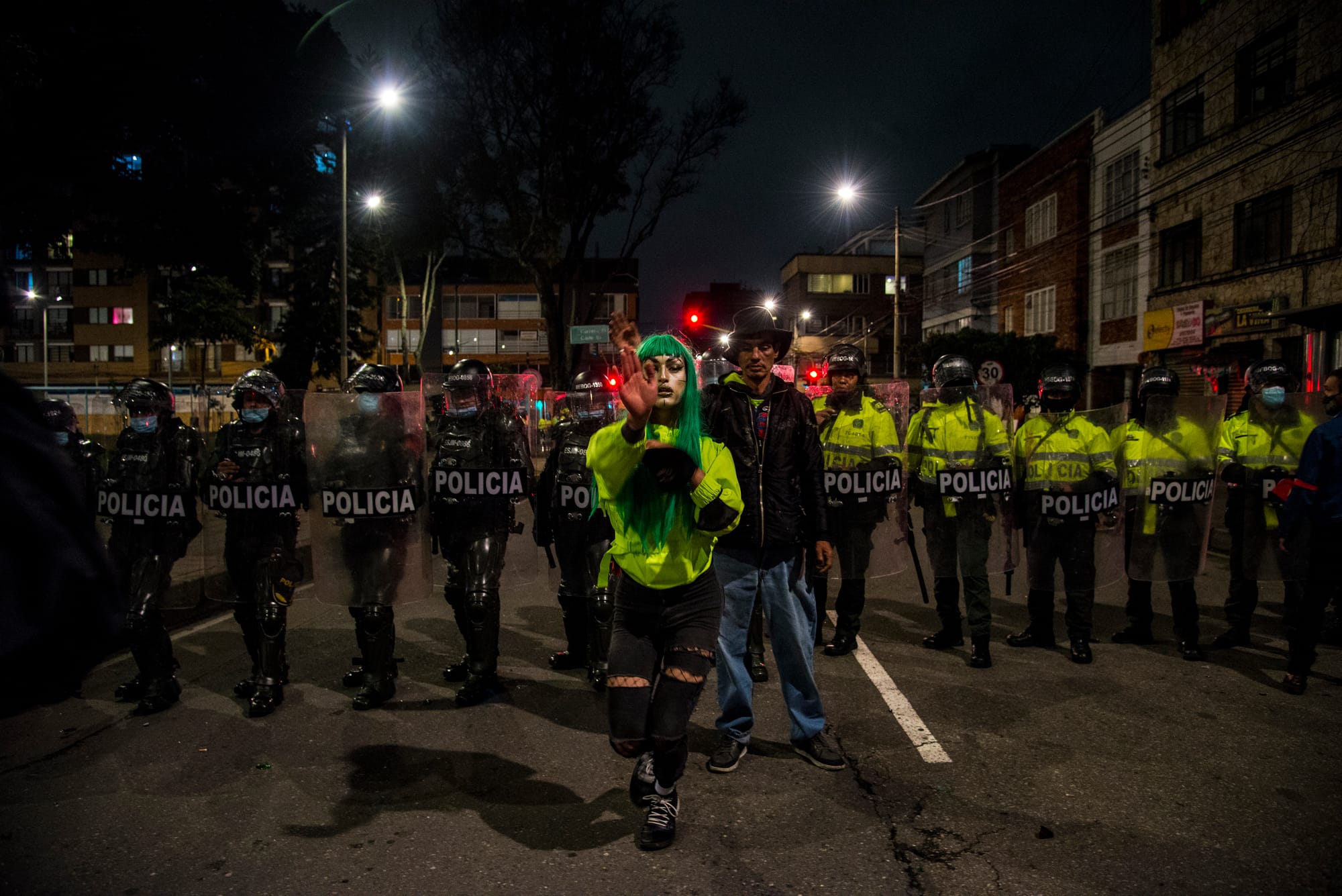 A protester performing a "vogue" dance in the hippies' park, Bogota. Tired of the English acronym "ACAB" (All Cops Are Bastards), LGBTQI protesters created a new one, "TOLOPOSUNGO", which is short for “all cops are Gonorrhea” in Spanish.