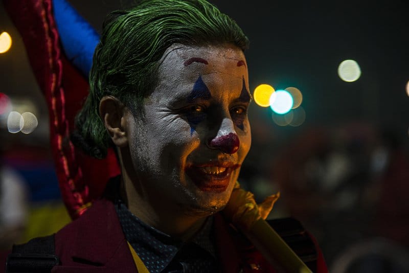 A protester dressed up as the Joker, a figure that embodies popular rebellion, near the iconic Monument to the Heroes in Bogota. Many came out to demonstrate in an artistic and creative way.