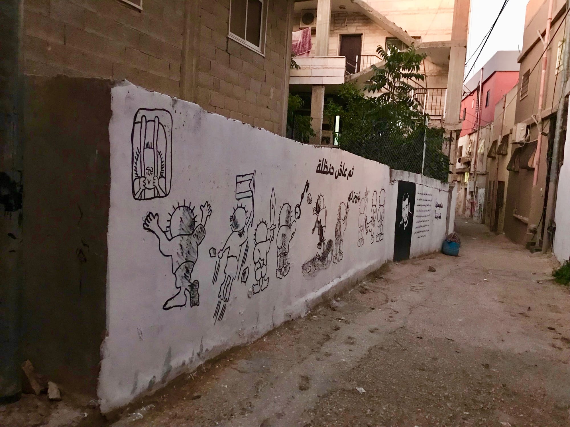 When you meet residents of Palestinian refugee camps, it becomes obvious that the occupation is not merely about occupying, controlling, and trapping people in open-air prisons. The occupation extends beyond these already-devastating effects to stunt and damage the future of an entire population of youth and, with no immediate end to the occupation in sight, the futures of generations still to come. The antidote to this systematic brutality is resistance. The widely recognized symbol of Palestinian resistance is the political cartoon character Hanthala, who appears repeatedly on walls throughout the camp.