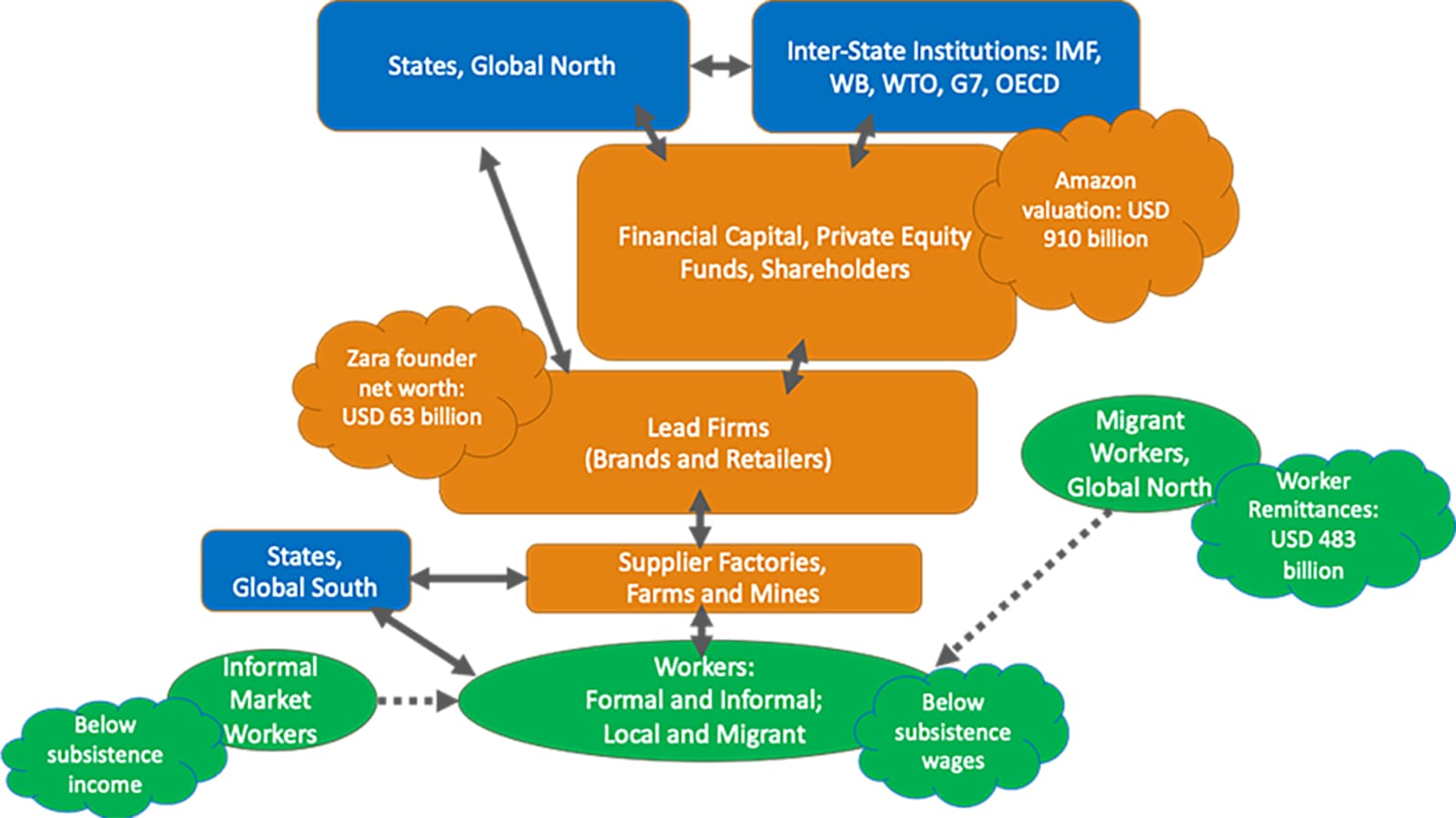 The top of the global supply chain does not end with the finance sector. One step higher are those who make the rules of the game that allow for this massive concentration of wealth and power. States in the Global North made the decisions to deregulate financial markets, especially in the United States. And inter-state institutions, such as the World Trade Organization in the 1990s, made the decisions that liberalised trade in sectors such as apparel, contributing to the further global dispersion of production.