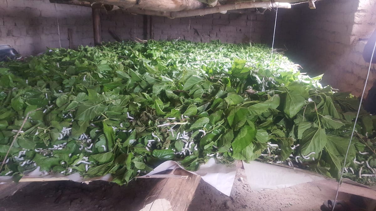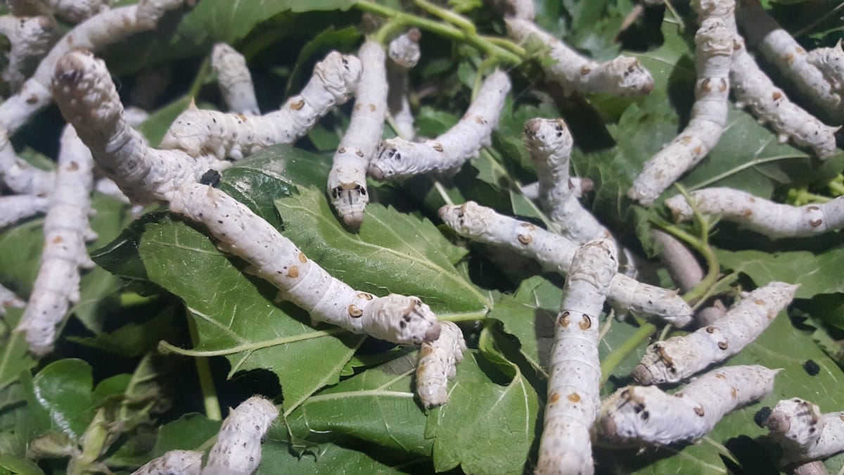 After the silkworm eggs (nowadays imported from China) are incubated until they hatch into larvae (caterpillars), they are distributed to farms. The process then takes about a month. The caterpillars feed only on mulberry leaves, and the breeding develops phase-wise, as the caterpillars mature.