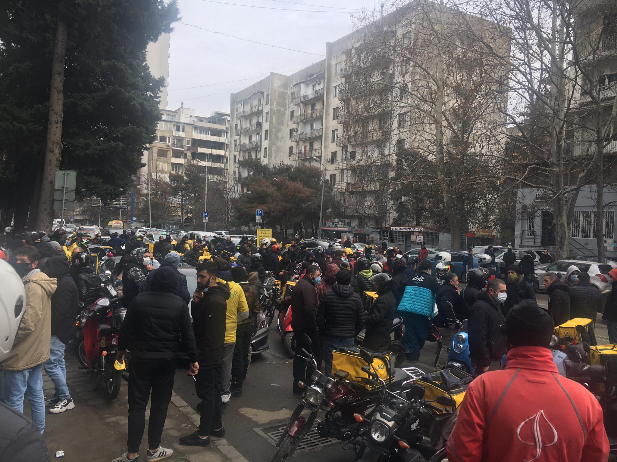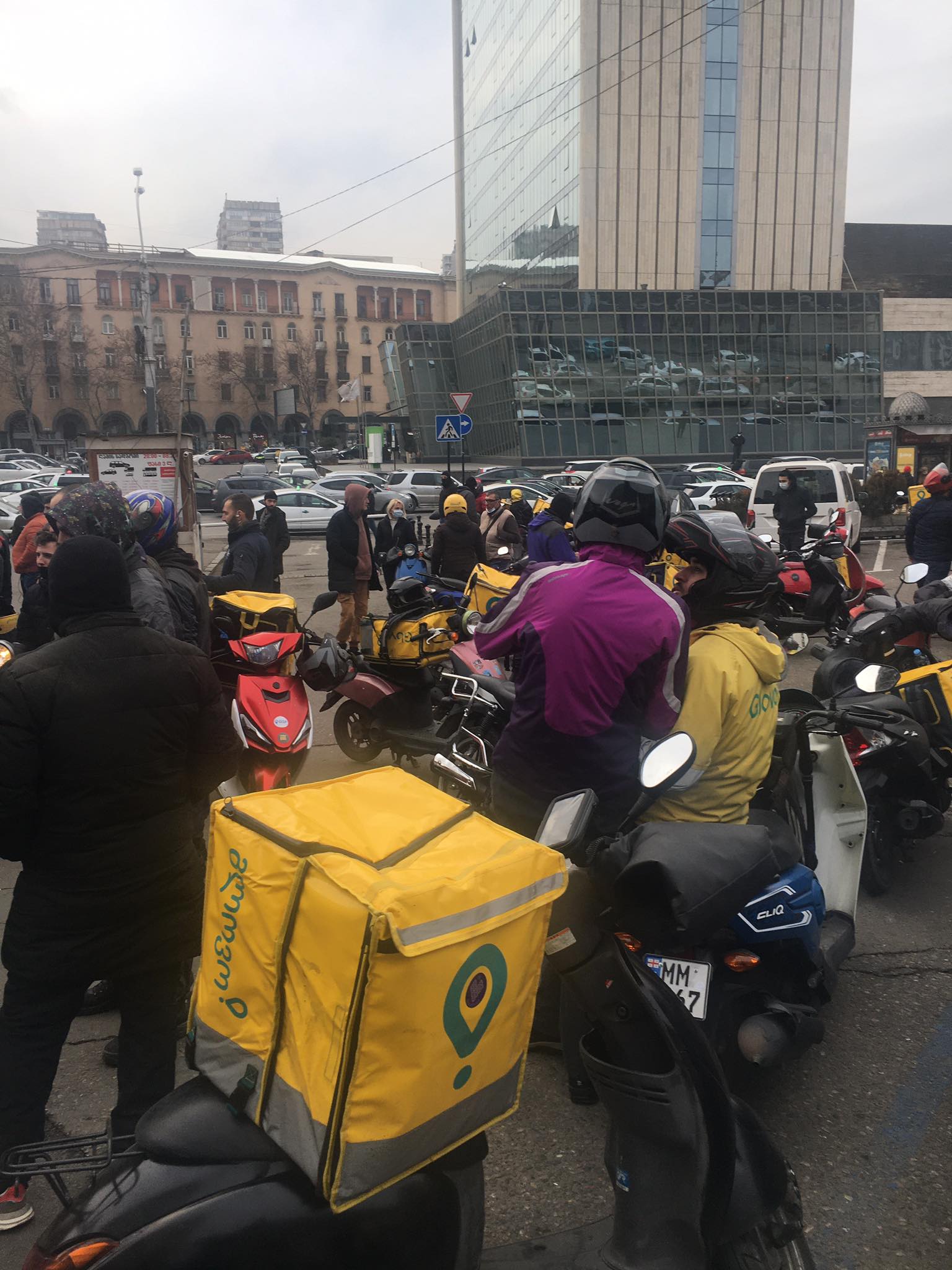 It is 29 January. Most of these men – and they are predominantly men – are here to protest recent changes to the terms and conditions of their work for Glovo, an international on-demand delivery company operating in the Georgian capital.