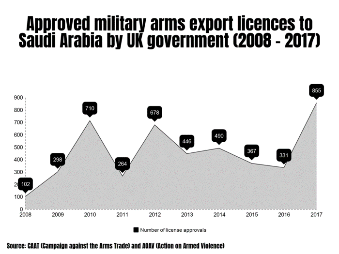 This ruling is a blow to the UK arms industry. Between 2008 and 2017, over 5,200 British military licenses were approved for arms exports to Saudi Arabia, worth some £10.3 billion. The largest single export amount was in 2015, worth £2.9 billion, over 40% of all of the UK’s military arms exports globally that year.