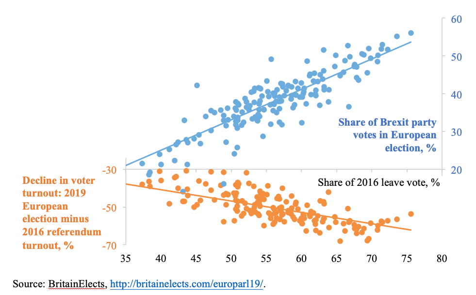 The two faces of political alienation in the European parliamentary election: in Leave districts, voters favoured the Brexit Party or they preferred not to vote:
