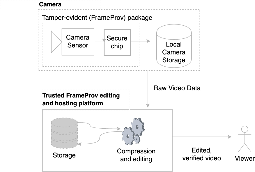 At the heart of FrameProv lies a novel data fingerprint that keeps track of each frame as it leaves the camera’s sensor. Any changes made to the frames from this point onwards would immediately destroy the fingerprint thus making it obvious that an edit has taken place. We then provide video editors with a language to specify edits they want to make. The list of edits they make are then attributed to the editor’s credentials. In this way, the editor can claim both responsibility and credit for the edits they’ve done. Only if all editors that worked on a particular video make this assertion and release it to the public will the FrameProv system accredit the video.