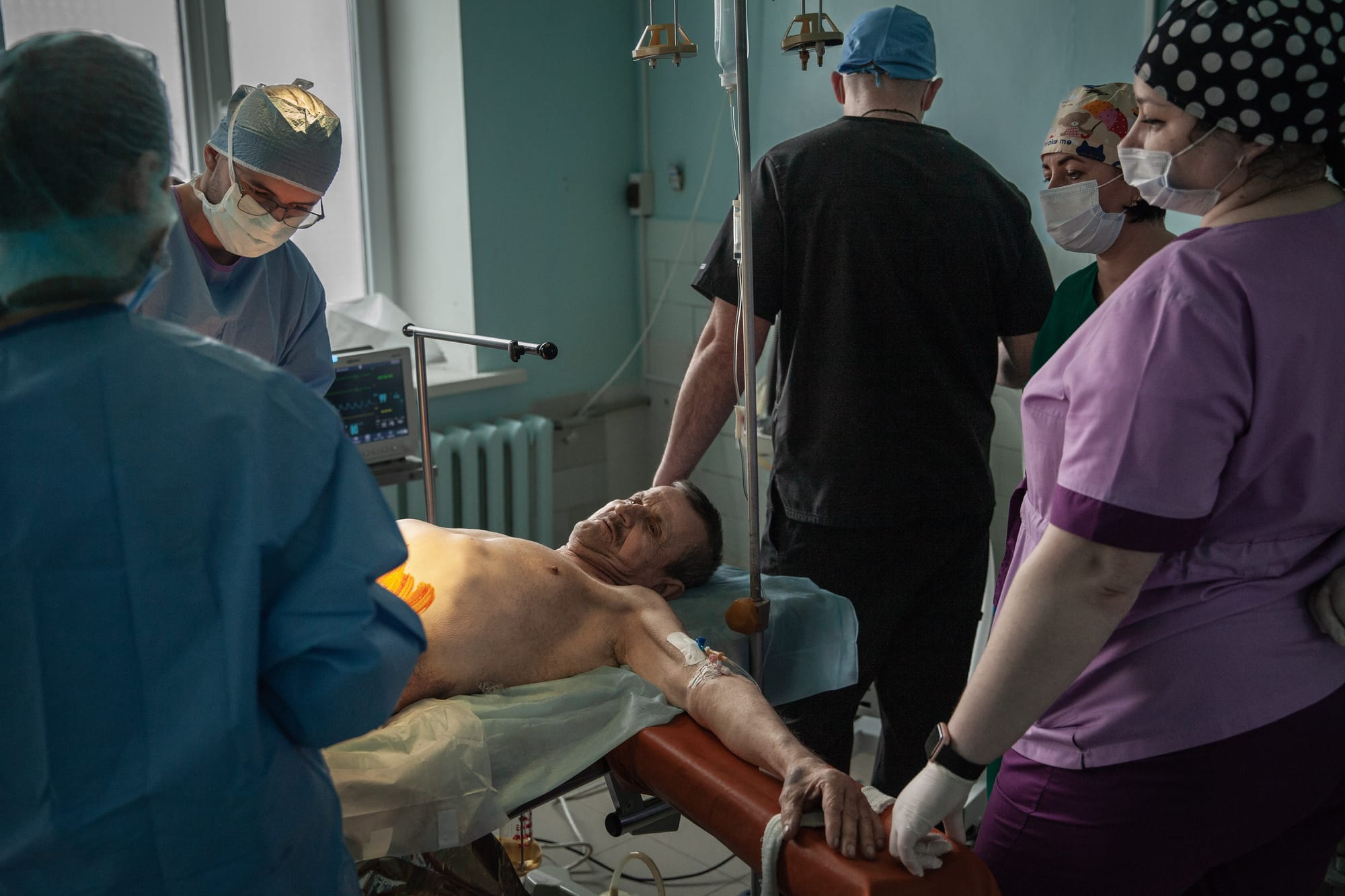 The hospital gurney on which Valeriy is carried into the operating room is shaped like a cross. Cloth ties each arm loosely to the perpendicular extensions. The 52-year-old has been shot in the abdomen. Now it’s time to clean his wound.