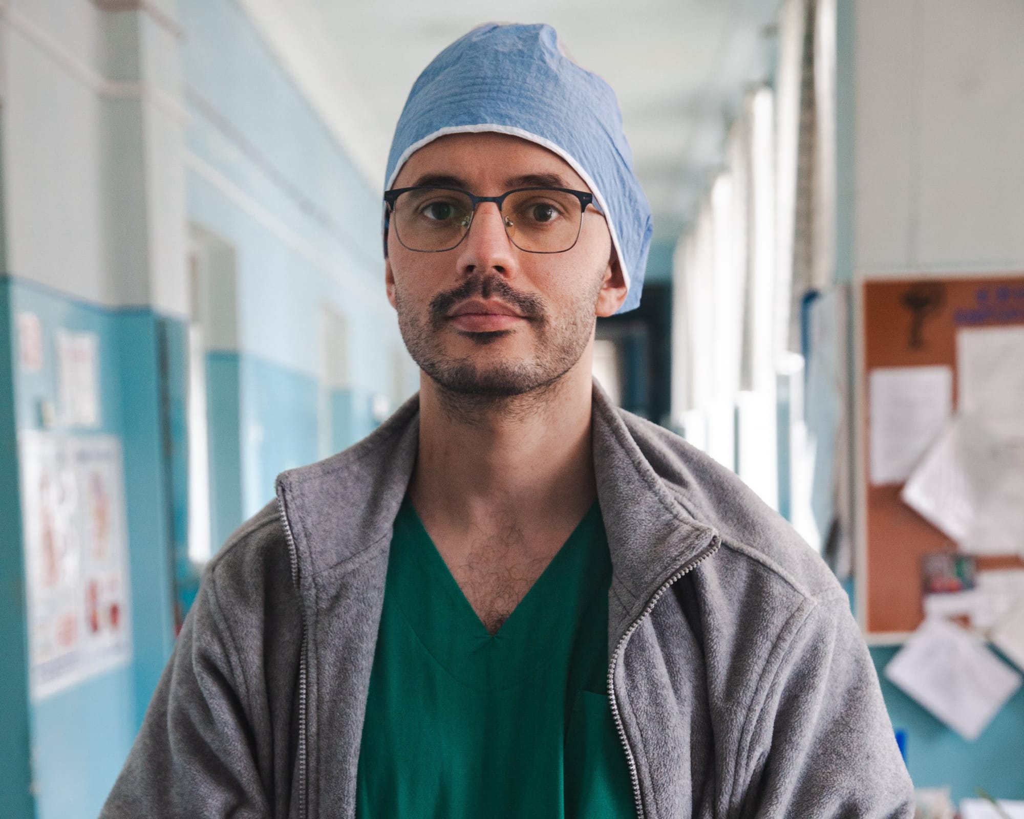 Valeriy, who also lost most of his hearing during the incident, groans as nurses prepare his wound for cleaning. Bloodied gauze protrudes from two holes on the left and right of his stomach. Though the bullet passed through without damaging any organs, the holes are wide enough to take a bottle of water. Within minutes El-Kafarna and the team have removed the gauze packing, disinfected the wound and rewrapped Valeriy’s abdominal area, tasks that have become all too familiar to the doctor, who has been working in Kostiantynivka for nearly a year after spending the initial months of the war in Kyiv.