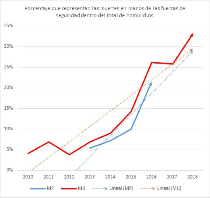 The percentage of these murders as a part of the total homicide rate is increasing: in 2010 only 4% of homicides were caused by the state security forces; just eight years later it has reached 33%. This means that currently one in every three homicides that occurs is the result of intervention from the state security forces.