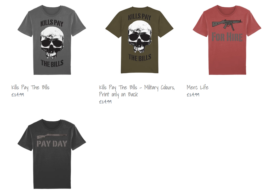 Direct HAF has a number of T-shirts on their website which glorify violence, with slogans including “happiness is high explosives”, a skull with a bullet shot through it with “head shot”, another with a skull and “kills pay the bills” and one with the image of a semi-automatic shotgun and described as “merc life”.