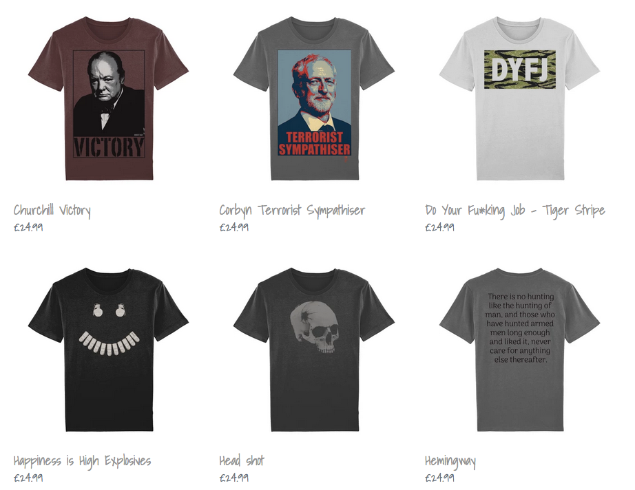 The anti-Corbyn advert is promoted by a website called Direct HAF which sells clothing with a mercenary theme. The site’s logo is a skull with a bullet hole in it and it proudly declares itself “comfortable with violence”.