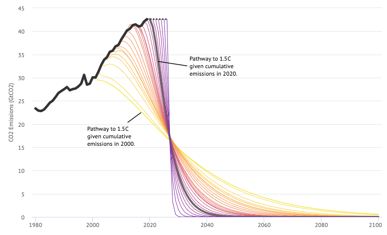Although impressive on paper, for the most part this was not matched by action. Emissions continued to rise every year after the agreement was signed, leaving our “carbon budget” for staying within the 1.5C target shrinking ever smaller. On current trajectories, the world is expected to breach the 1.5C ceiling in less than a decade – and hit 3C of warming by the end of the century. Each passing year of inaction produces a compounding effect, necessitating ever steeper carbon reductions in future years.