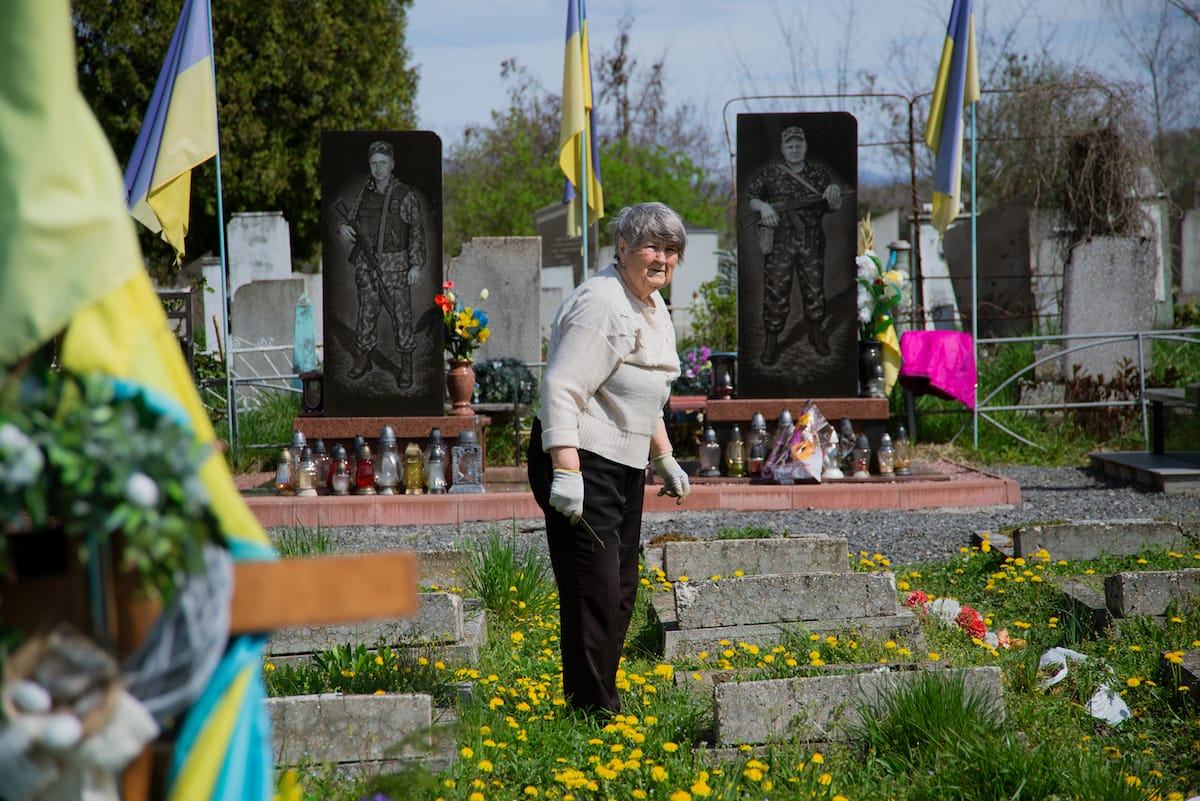 Valentyna Pavliuk, 82, comes to clean weeds from around the grave of her son Oleksandr, who was killed in 2015. She even planted flowers on some nearby, older Soviet military graves, “so it was nicer around my son”.