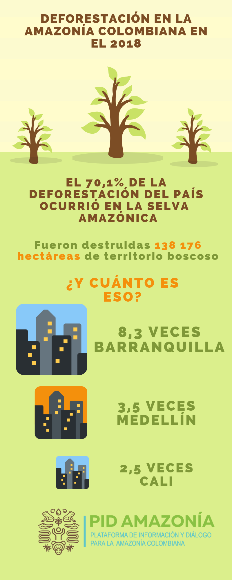 Más allá de los porcentajes, para entender la gravedad del problema, resulta más aclarador evaluar la situación según la extensión de selva Amazónica que fue destruida en el 2018. Siguiendo el reporte del Ideam, el área arrasada corresponde a 138.176 hectáreas. Si se contrasta este dato con la extensión de algunas de las principales ciudades del país, se tiene que la cantidad de selva talada equivale a 2.5 veces la extensión de Cali, 3.5 veces la de Medellín, y 8.3 veces la de Barranquilla. Estas comparaciones ilustran la seriedad de la situación, y por consiguiente, la necesidad de afrontarla con acciones contundentes.