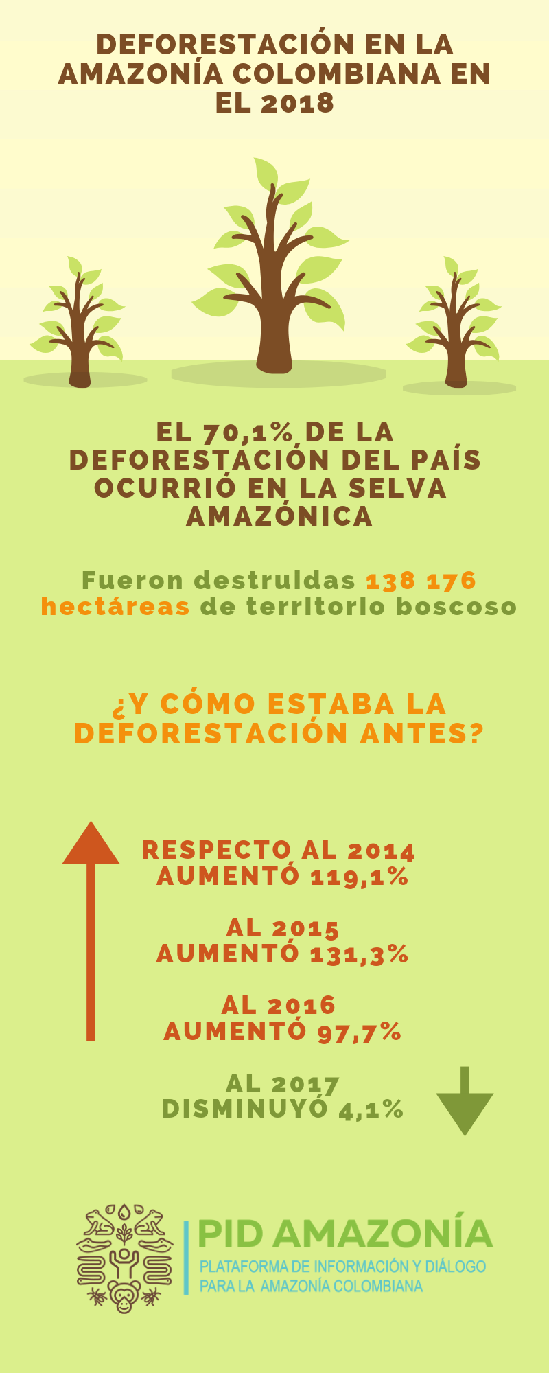 Aunque el Ministerio de Ambiente considere que se ha logrado un avance considerable en la protección de las selvas y bosques del país, un análisis cauteloso de los datos de la región Amazónica arroja un panorama muy diferente. En efecto, según el informe del IDEAM, el 49% de la deforestación total del país se concentra en siete municipios amazónicos. Además el 70,1% de la totalidad de la deforestación nacional se dio en la Amazonía, 4,6% más que el año anterior y 31,1% más que en 2016.
