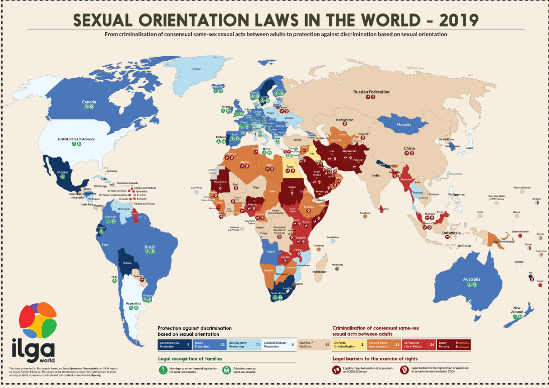 Pero hay otros mapas, como el que realiza ILGA anualmente, que me ofrece la posibilidad de informarme, observar, analizar, cuál es la situación de nosotrxs, las personas LGBTIQ (lesbianas, gays, trans/travestis, bisexuales, intersex y queer) en el mundo. El mapa adjunto, por ejemplo, se centra en la legislación, o falta de ella, respecto a la orientación sexual. Incluye desde la criminalización por actos sexuales consensuados entre personas adultas del mismo sexo, hasta la discriminación por orientación sexual. Hay otro mapa, producido por oiiEUROPE, donde se dan a conocer las buenas prácticas desarrolladas en algunos países de Europa en lo que refiere a las personas intersex.