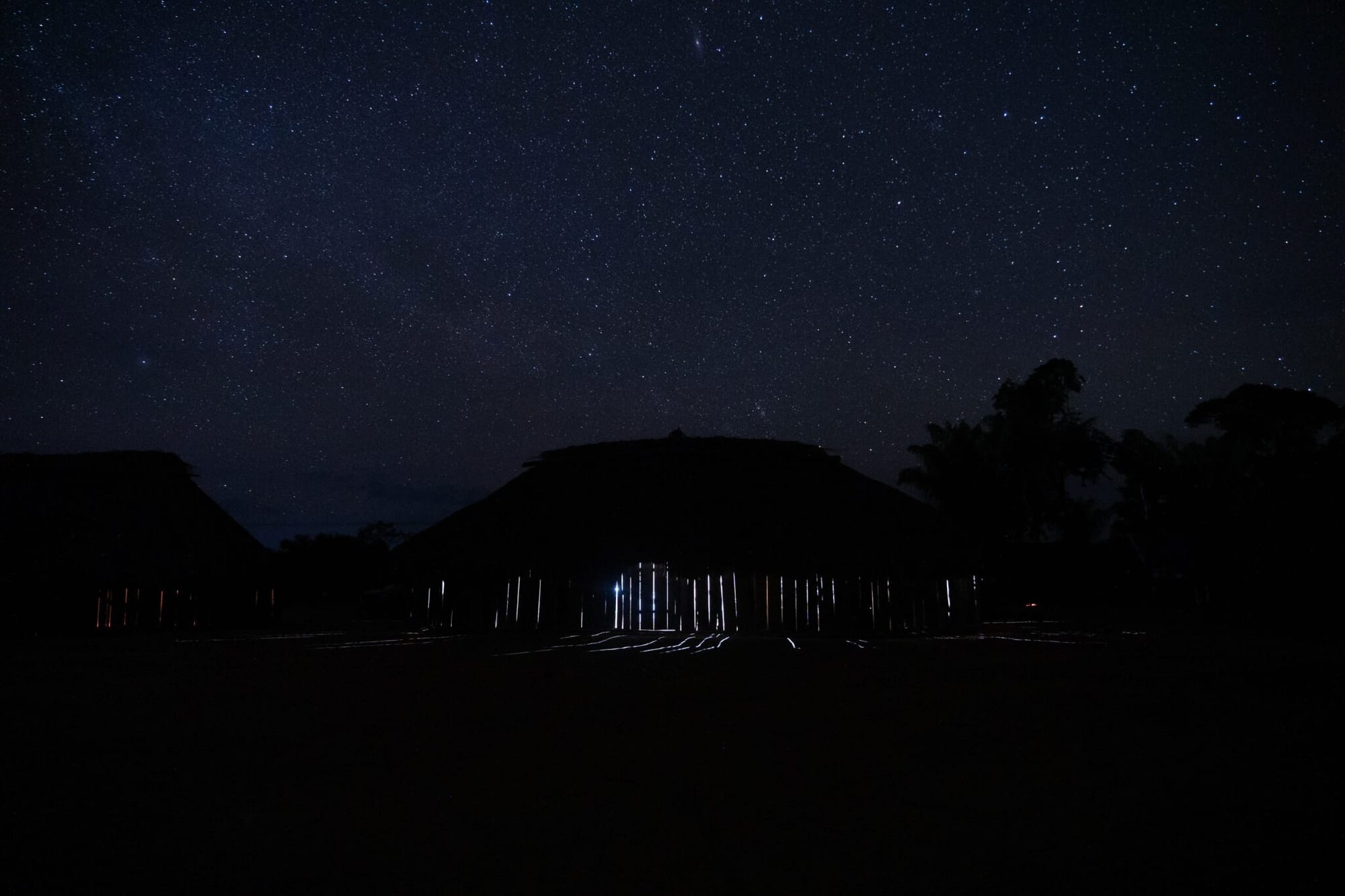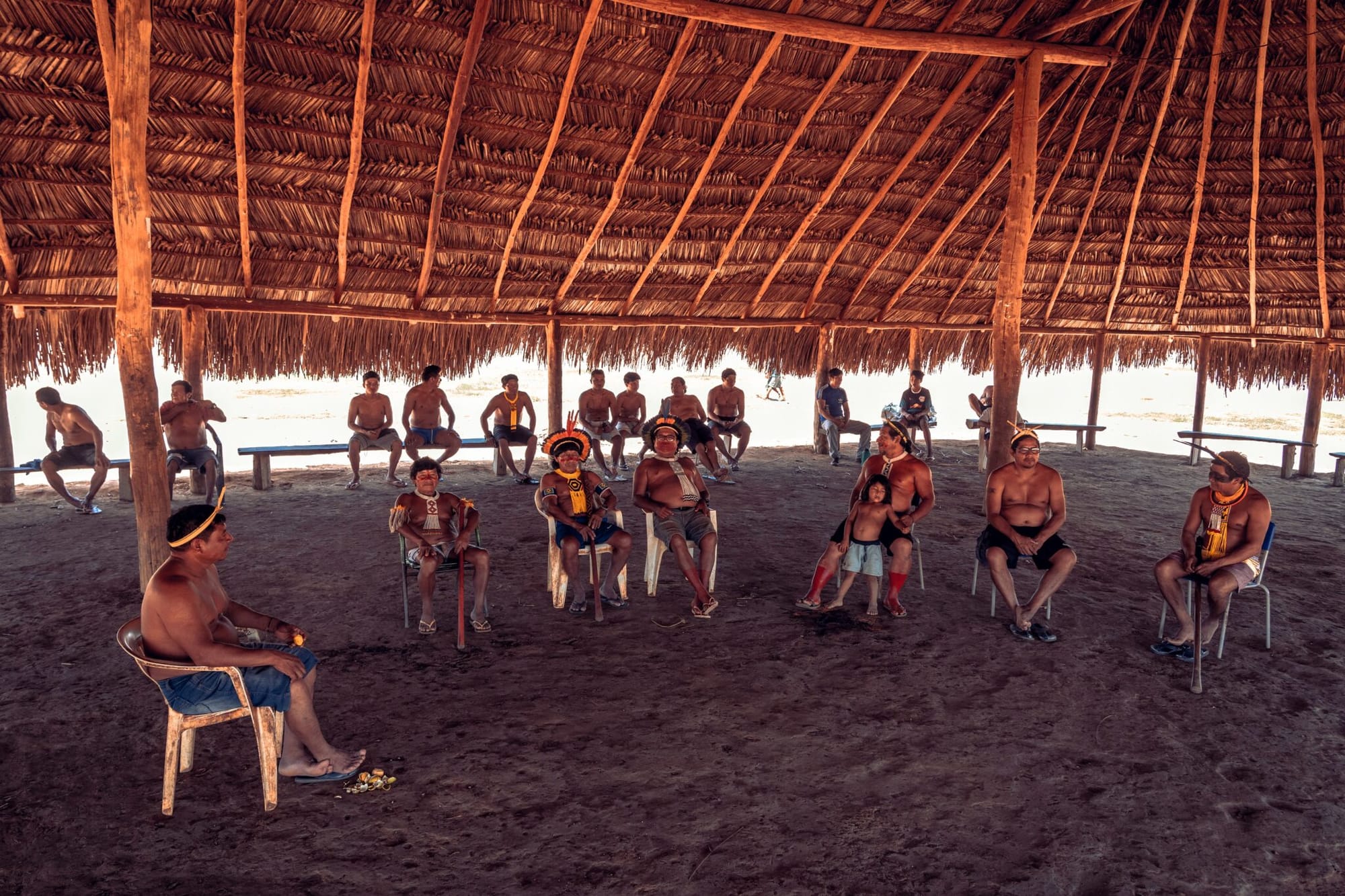 Cada noche, los hombres kisêdjê llevan sillas de plástico al centro de un enorme patio rodeado por las decenas de chozas que componen la aldea Khikatxi. La estación seca y la escasa luz se combinan para crear un cielo negro profundo y estrellado sobre el territorio indígena wawi, en el noreste del estado brasileño de Mato Grosso. Habitualmente se reúnen para tratar los asuntos de la comunidad o simplemente para hablar sobre el día. Se sientan en círculo en la oscuridad, interrumpida ocasionalmente por el brillo ardiente de un cigarrillo o la pantalla de un teléfono móvil.