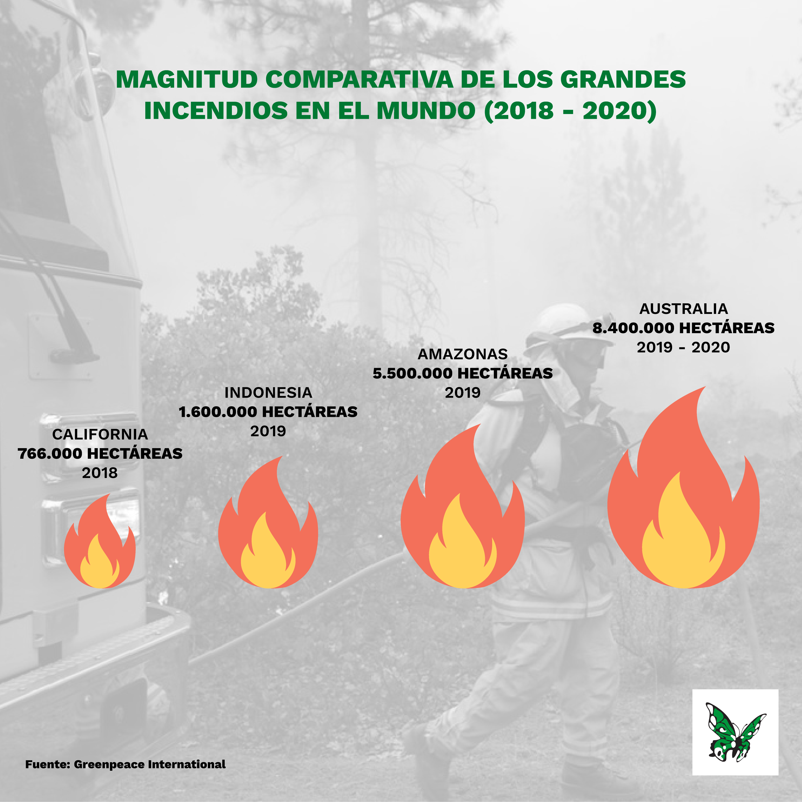 El año pasado, en Brasil ardieron unas 5.500.000 hectáreas en la región del Amazonas por culpa de incendios forestales, muchos de los cuales se podrían haber evitado con un mayor control de las autoridades, según Greenpeace International. Esta cifra representa un aumento de más del 80% frente al año anterior; aumento que coincide con el primer año de gestión del ahora presidente, Jair Bolsonaro.