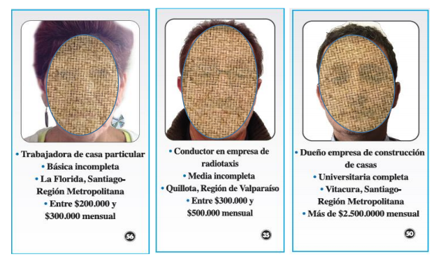 En las semanas siguientes al 18/O, nos reunimos con seis grupos en Santiago y tres en Puerto Montt, cada uno integrado por unas seis personas y pertenecientes a un estrato medio-alto, medio-bajo y bajo, seleccionadas de acuerdo con criterios de ocupación, sexo, ingresos y educación. En el caso de Santiago, nos habíamos reunido con los mismos grupos de personas antes del estallido, de modo que tras éste, pudimos establecer líneas de comparación. La conversación se apoyó en siete tarjetas o viñetas que representaban a personas reales en la sociedad chilena: un joven de escasos recursos de la comuna de Pedro Aguirre Cerda; una trabajadora de casa particular de La Florida, también de escasos recursos; un taxista de ingresos bajos de Quillota; un técnico de máquinas en un taller de Lo Espejo, con ingresos bajos; un jefe de local de un restaurante en Puerto Montt; el dueño de una empresa de construcción de ingresos medios-altos de Vitacura y un accionista de grandes empresas de Lo Barnechea; es decir, personas de diversos estratos sociales, hombres y mujeres, de distintos grupos de edad, así como de diferentes regiones del país[1]. Los temas de conversación estuvieron referidos a cómo lo estaba pasando la persona de cada tarjeta en esos días posteriores al estallido, a si esa persona apoya o no apoya las protestas y finalmente si acaso sus ideas cambiaron después del 18/O.