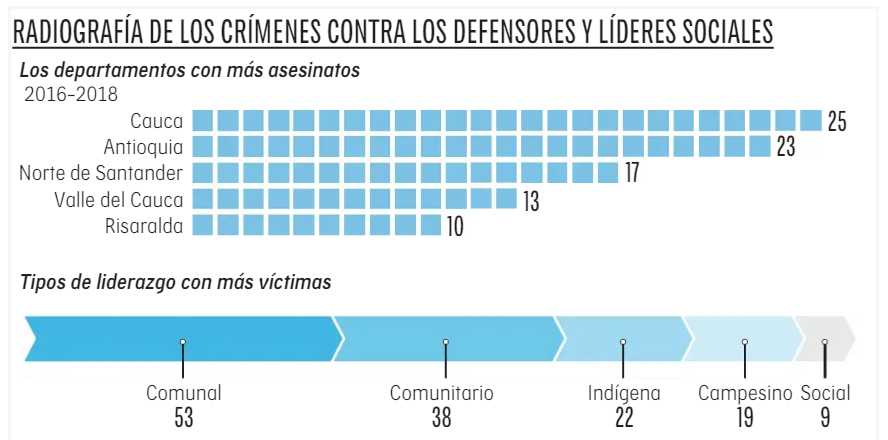 En lo que va del 2020, ya han sido asesinados 17 líderes sociales. Hasta las cifras más conservadoras son preocupantes: en el 2019 asesinaron a 107 líderes sociales según la ONU; según PACIFISTA!, el digital colombiano, serían hasta 254 los asesinados desde el 2017.