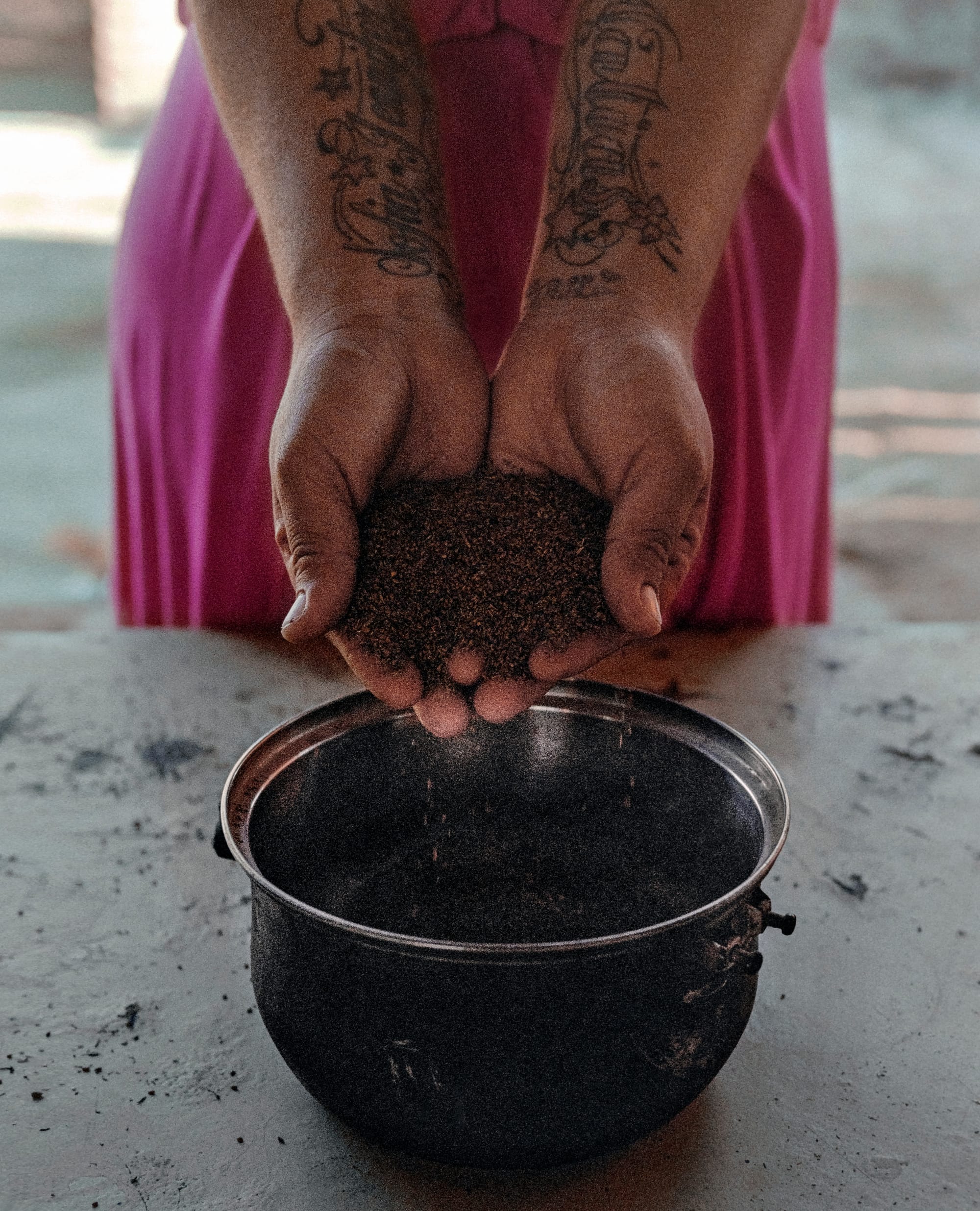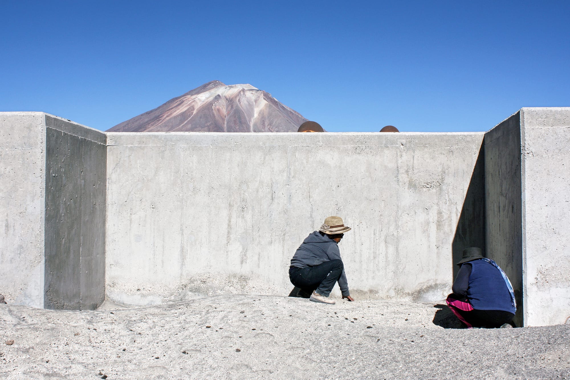 Dos líderes atacameñas likanantai realizan un pago a la tierra -ofrenda ancestral andina- en una estructura de despiche de agua en el salar Ojos de San Pedro, región de Antofagasta, Chile. Este Salar era una antigua laguna que fue desecada a finales de la década de 1960 por las faenas de las mineras Radomiro Tomic y Chuquicamata, ambas de la empresa Codelco. En su plegaria, las dos comuneras le prometen a la madre tierra que recuperarán el agua para beneficio de todos, pues el recurso hídrico ha sido apropiado por la industria minera y la empresa privada. | Gaspar Abrilot