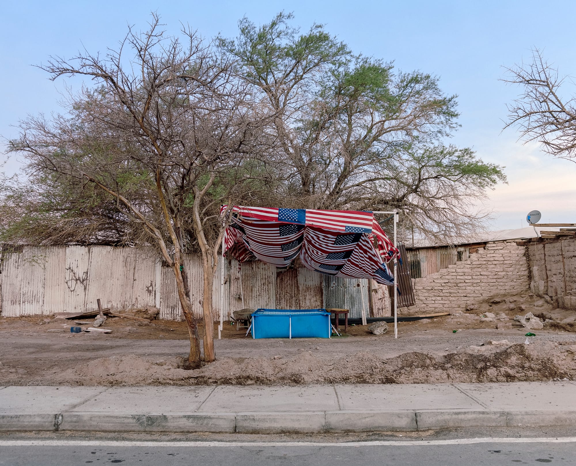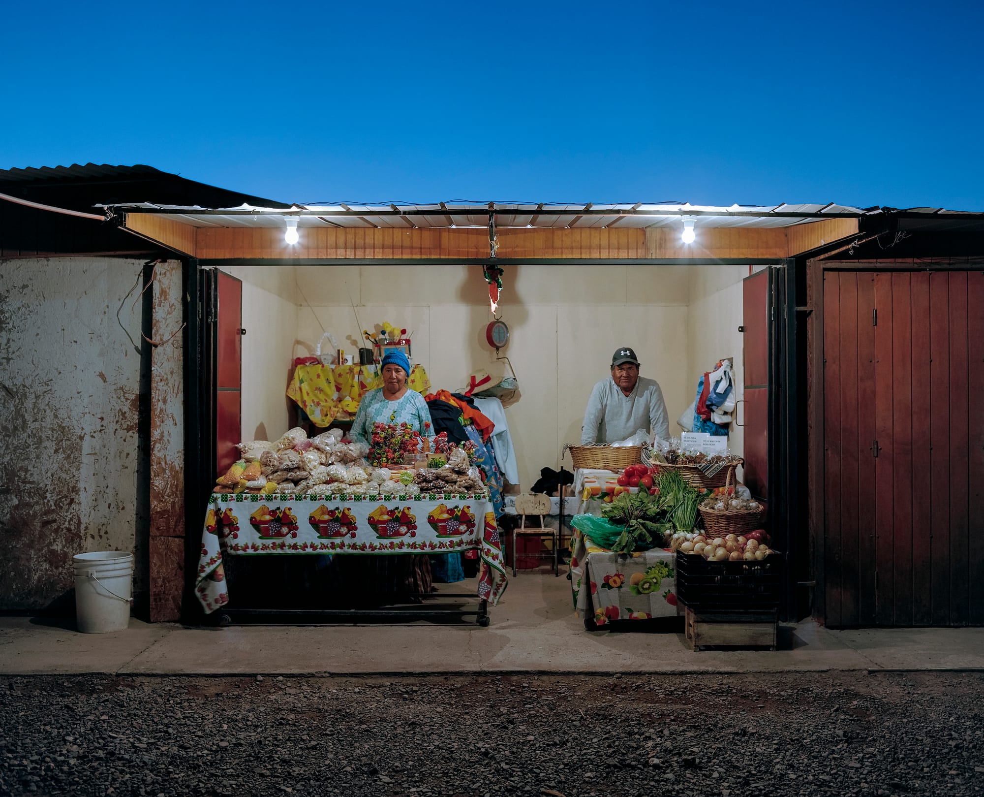 Una pareja de agricultores atiende su local de ventas en la plaza del pueblo de San Francisco de Chiu Chiu, un pequeño oasis ubicado a 30 km al este de la ciudad de Calama, región de Antofagasta, Chile. Sus productos son cultivados en el sector y regados con las aguas del río Loa, pese a la poca disponibilidad que tienen de ella debido al fuerte control de los derechos de agua por parte de la gran industria. El código de aguas de 1981, impuesto por la dictadura de Augusto Pinochet, privatizó los derechos de agua y reconfiguró el paisaje hídrico de estas comunidades, alterando las formas de riego tradicionales y transfiriendo el acceso y uso del agua del sector agropecuario hacia el sector minero y sanitario. | Gaspar Abrilot